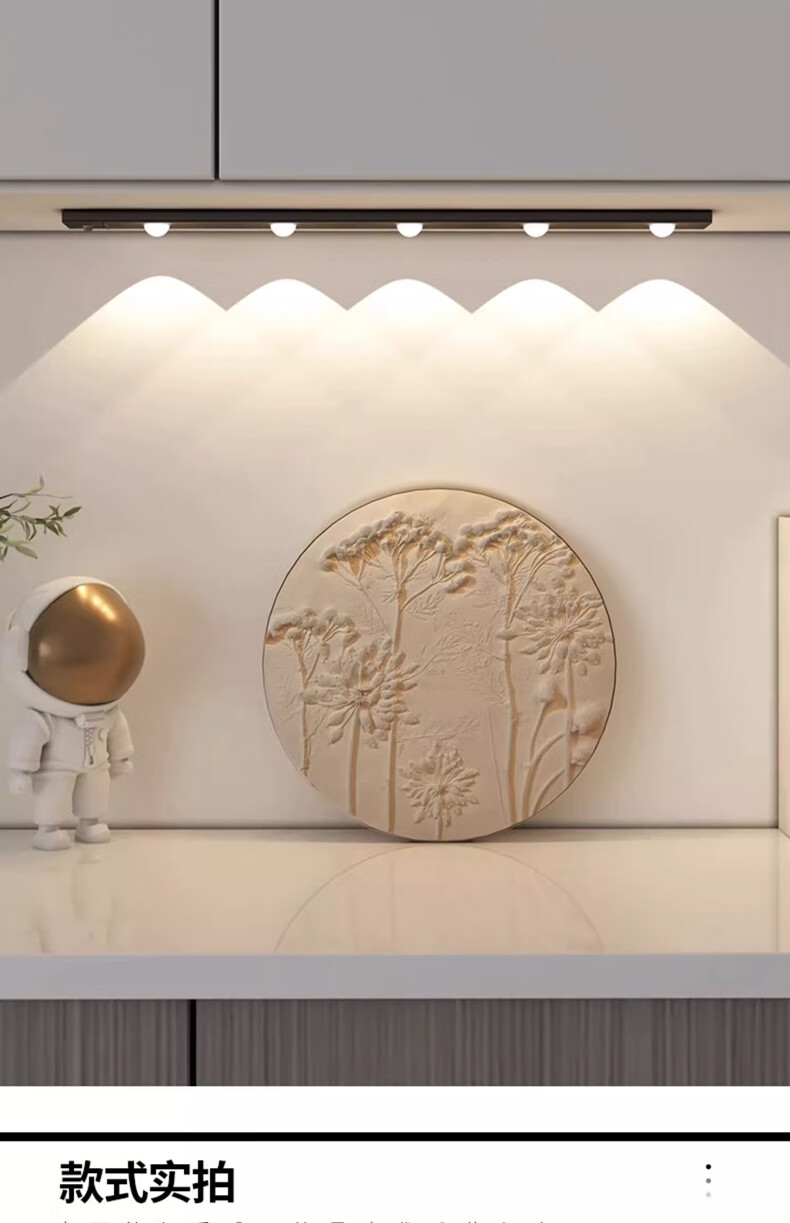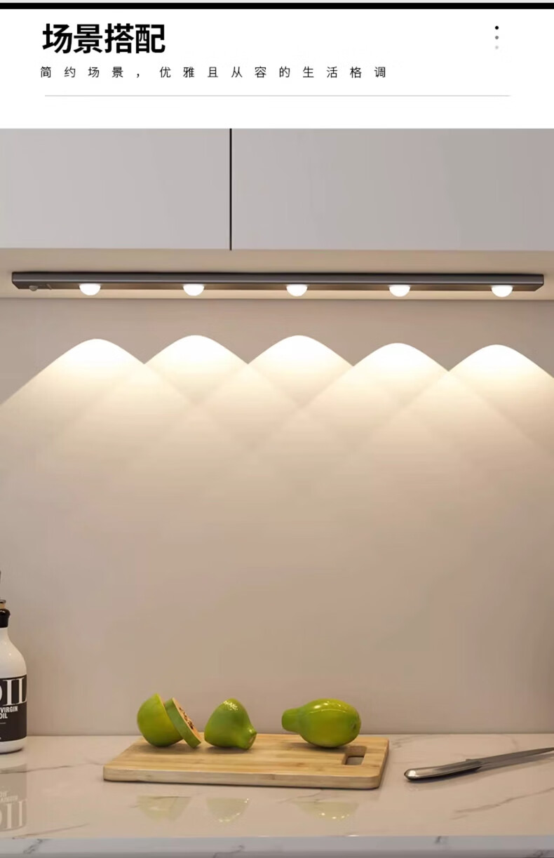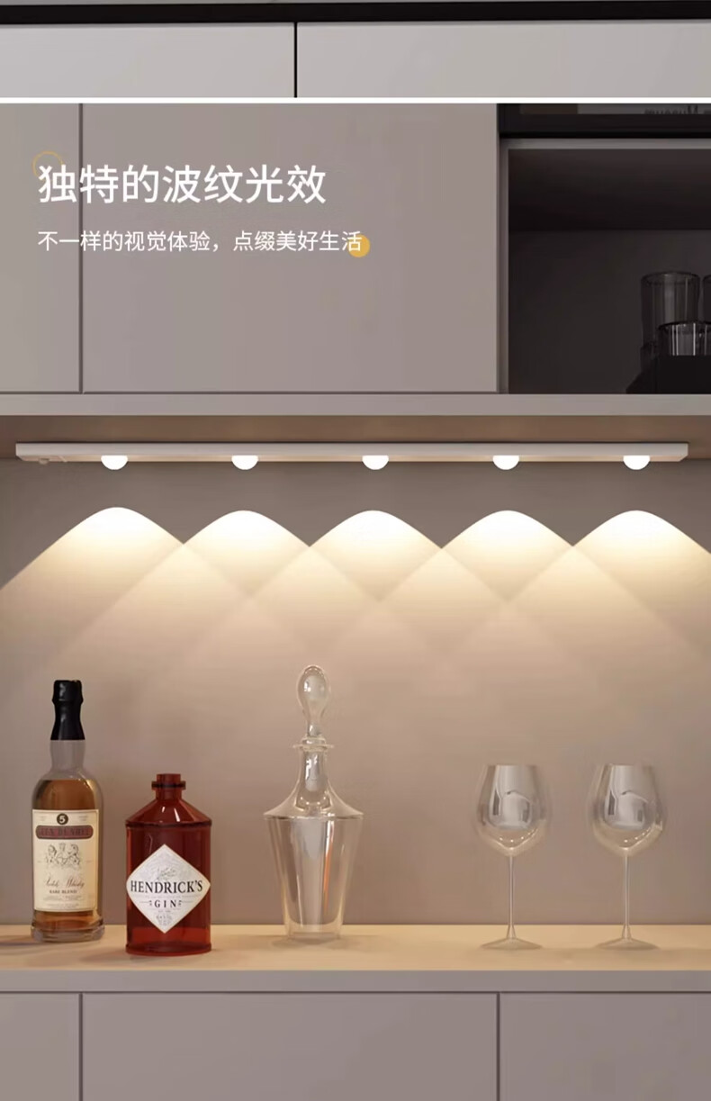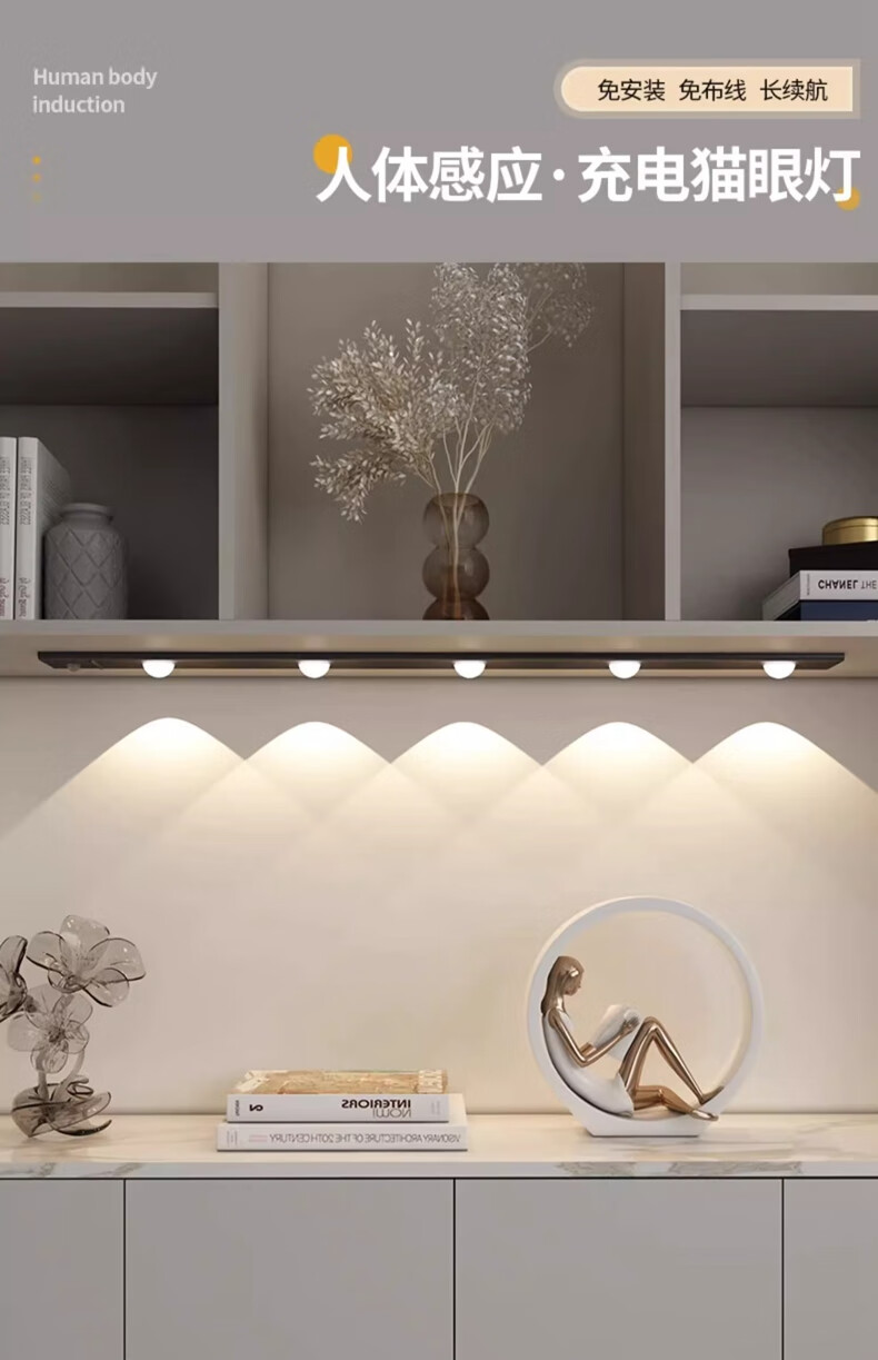 拉伯塔酒柜LED橱柜灯带充电人体感应灯无线衣柜猫眼灯鞋柜自粘磁吸灯条 5珠5波纹【80cm白壳】 【三色变光+双感应+可调光】