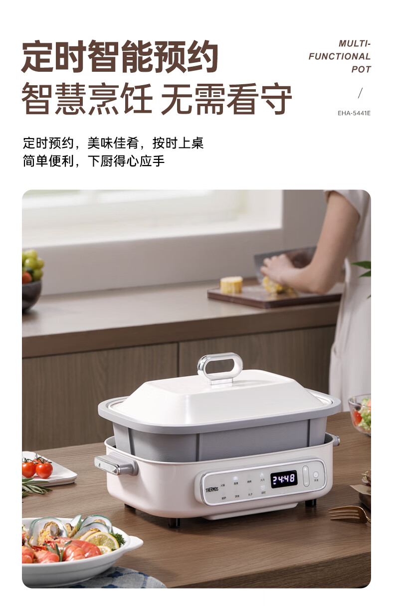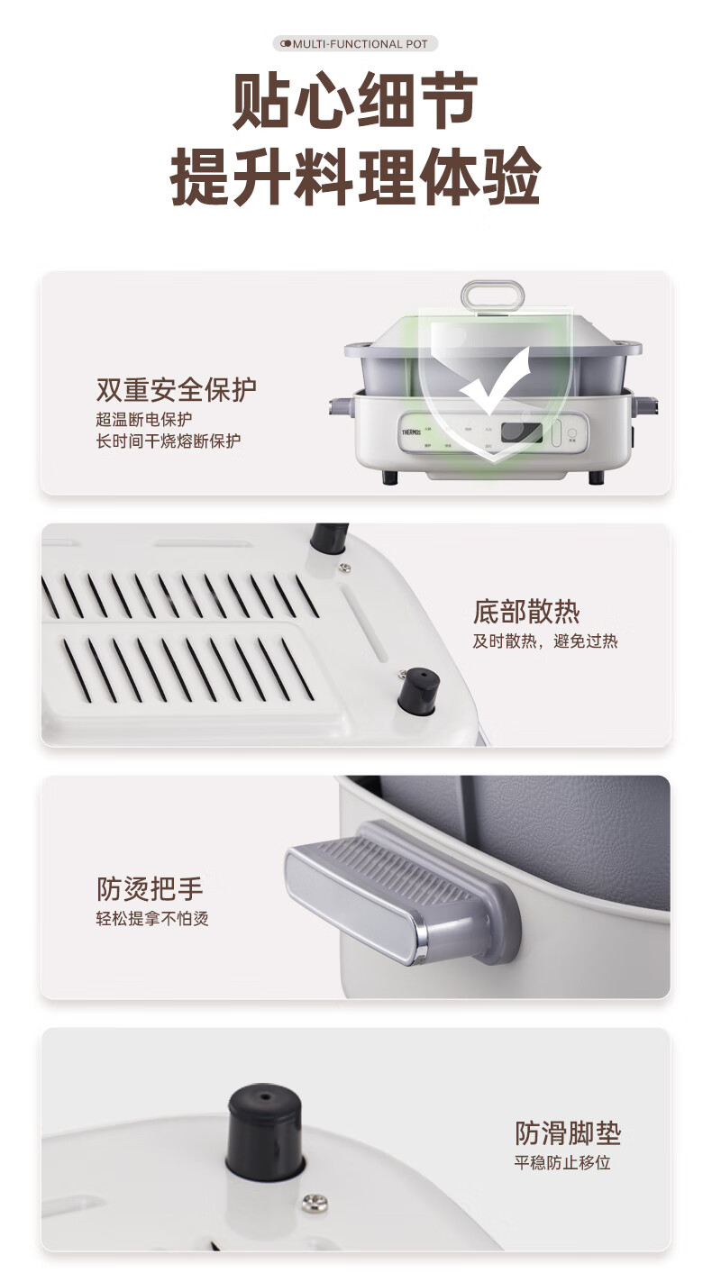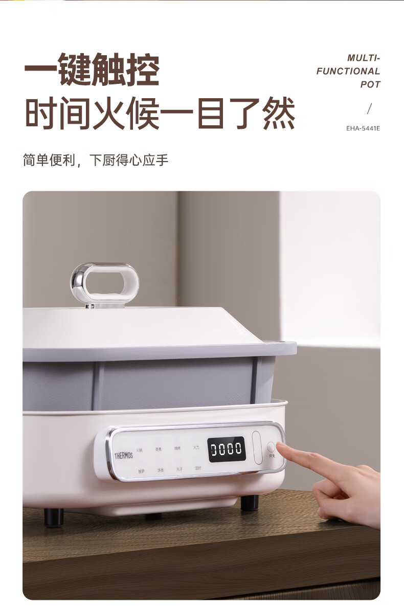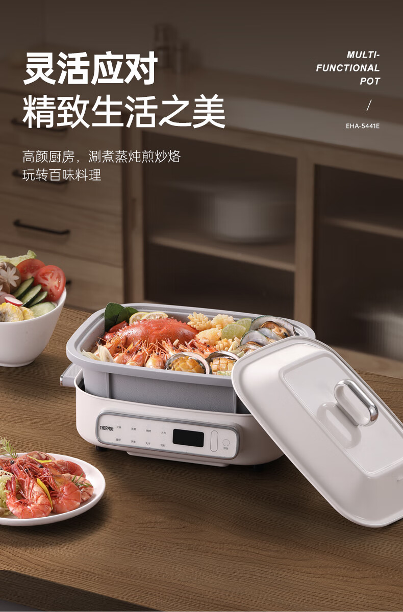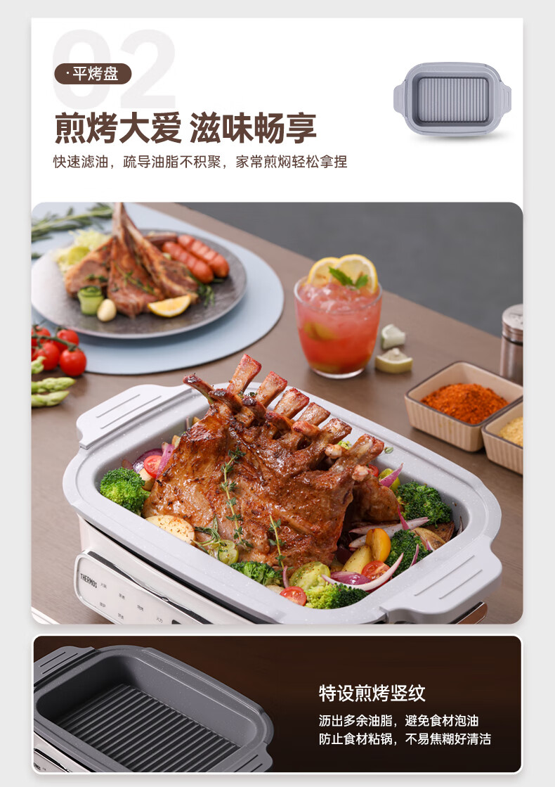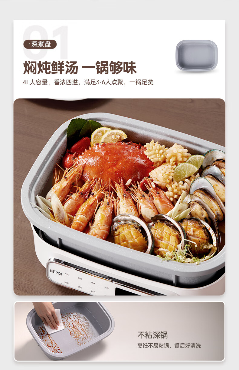 膳魔师(THERMOS)【年会礼品】料理锅电蒸锅炖蒸煮一体家用电火锅电炒锅电煮锅涮烤一体2025新款多功能锅分体式 4L 白标配【深锅+条纹烤盘+爱心盘+防烫手套】
