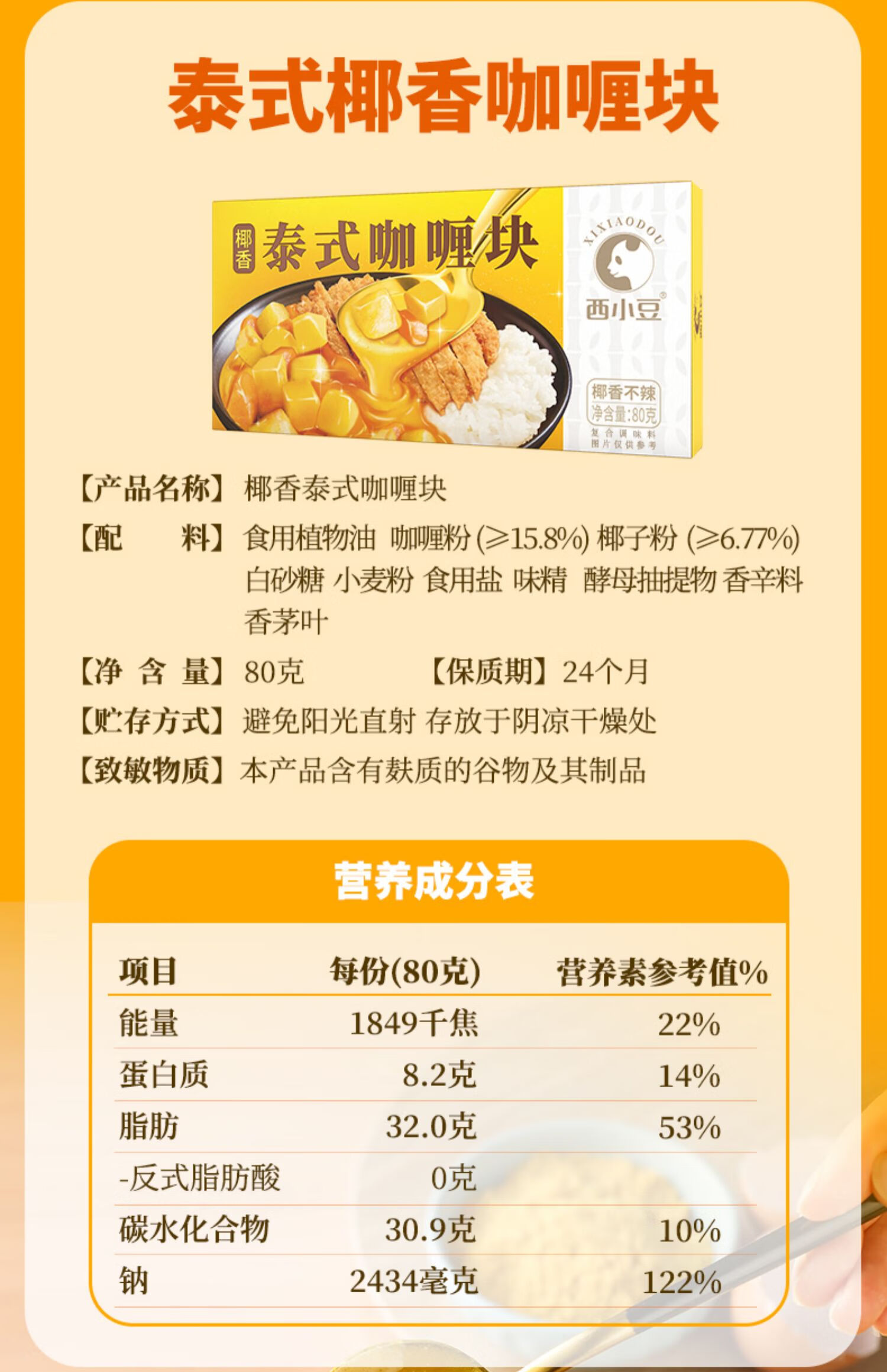 西小豆泰式椰香咖喱块家用泰式椰香咖喱酱饭料理包儿童爱吃咖喱下饭菜 泰式椰香咖喱块80g*4盒