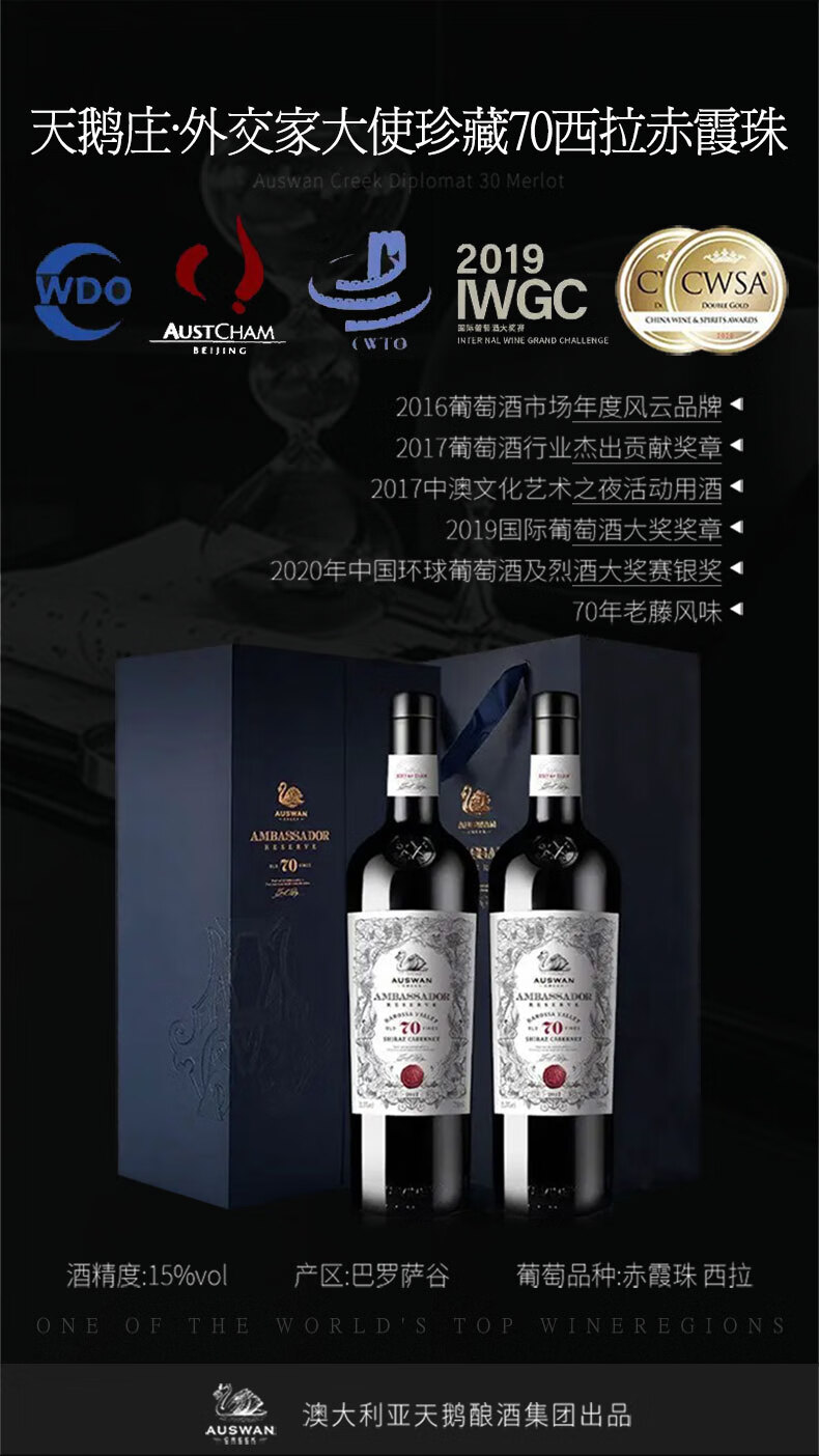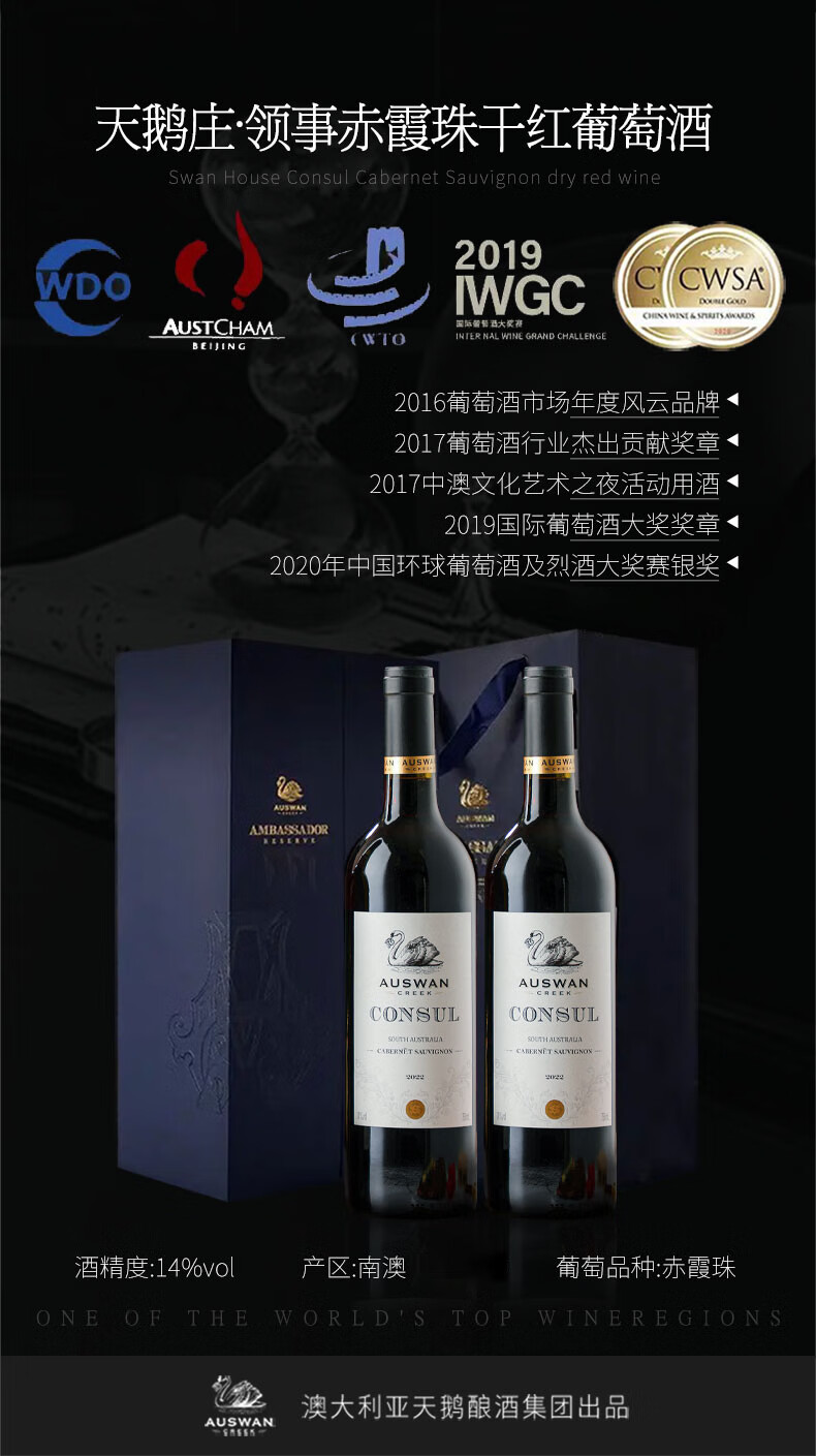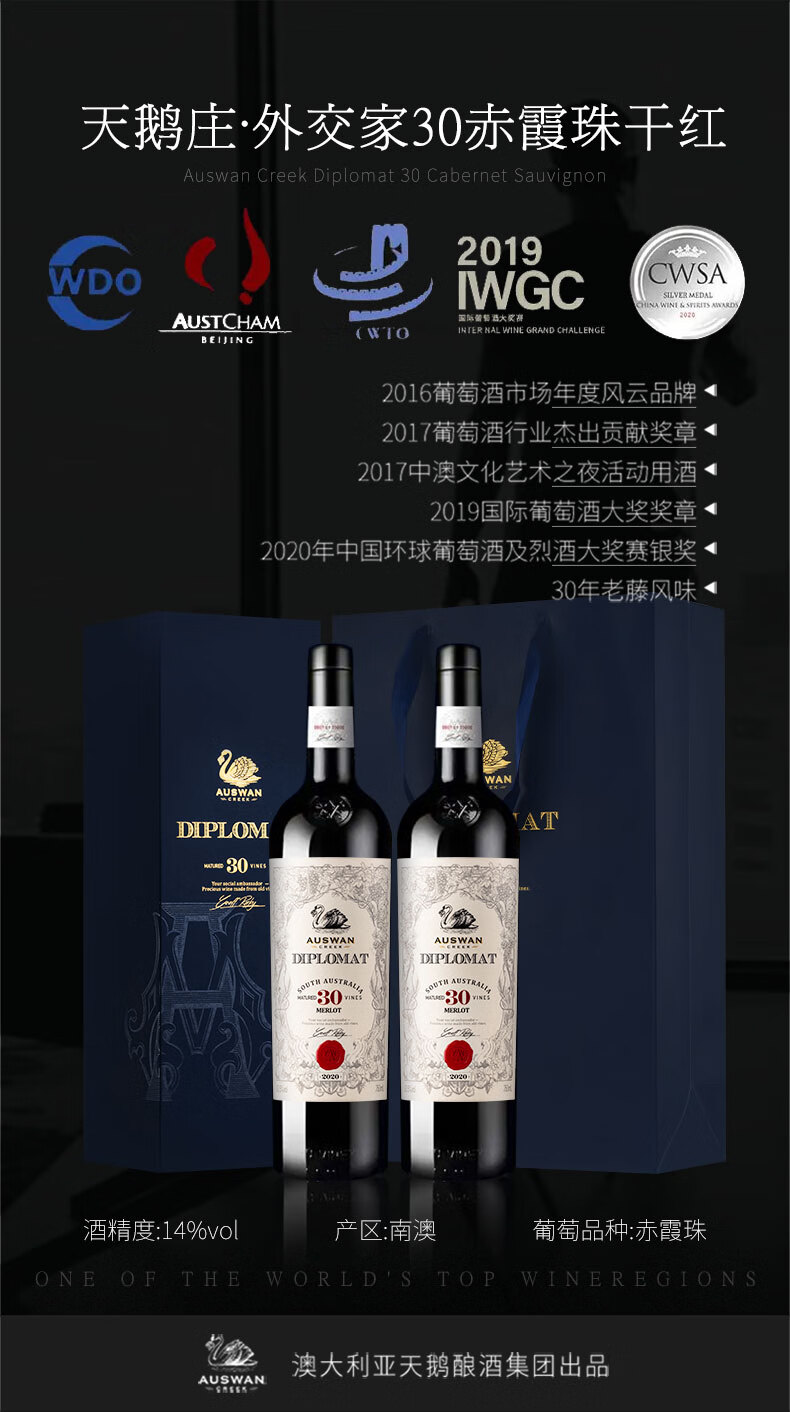 天鹅庄澳大利亚原瓶进口红酒干红葡萄酒外交家系列 高端礼盒年货送礼 外交家20赤霞珠 750ML2支礼盒