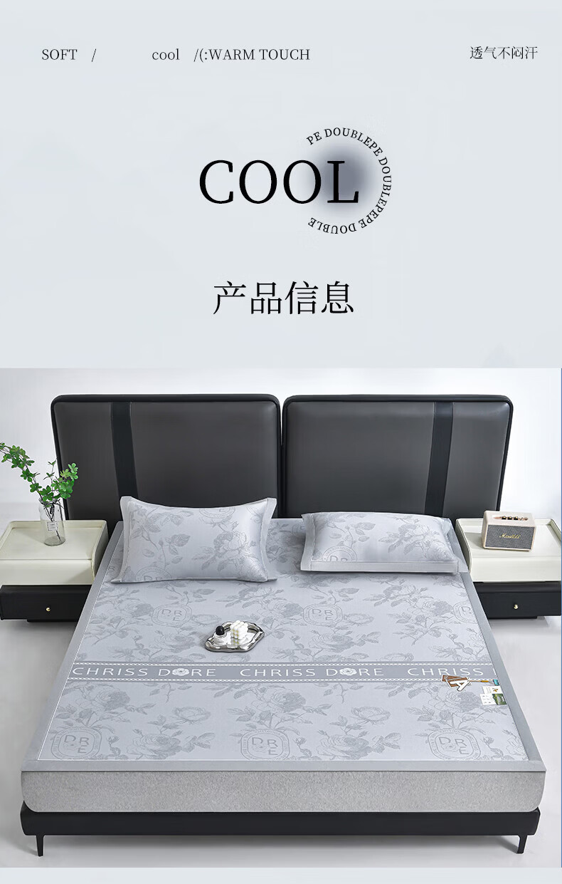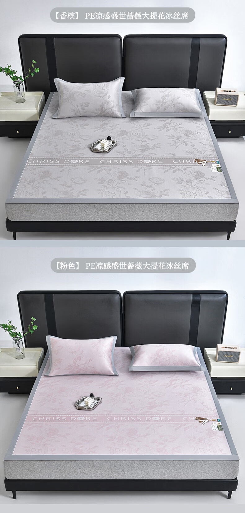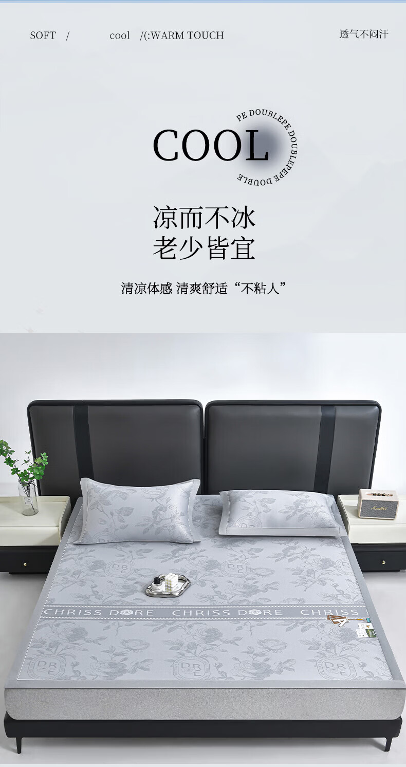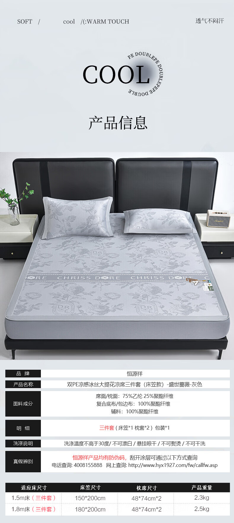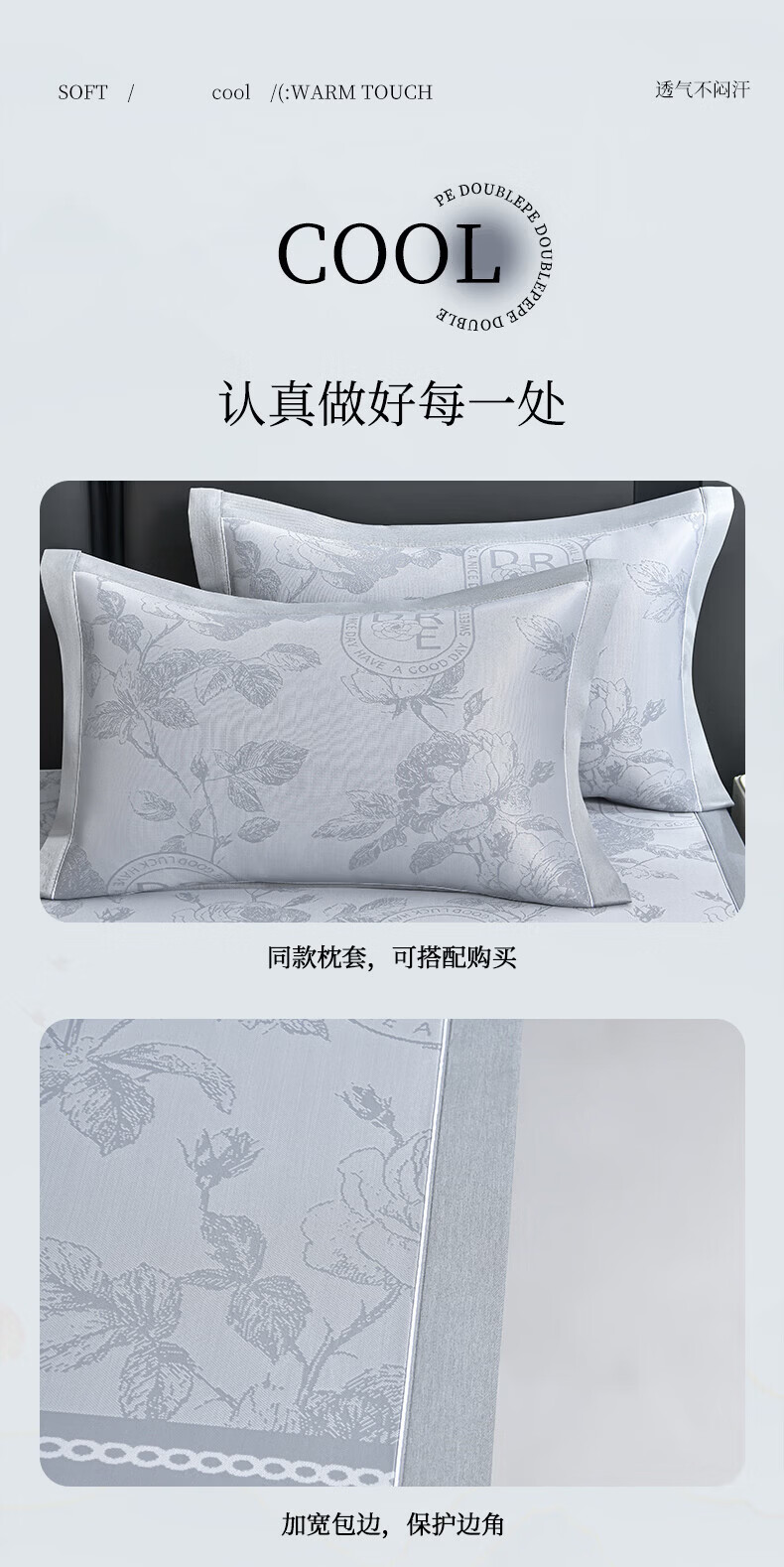 恒源祥冰丝凉席 A类夏季凉感可机洗刺绣学生宿舍单双人丝滑裸感凉席 香槟色【床笠款】 三件套180cm*200cm【一席二枕套】