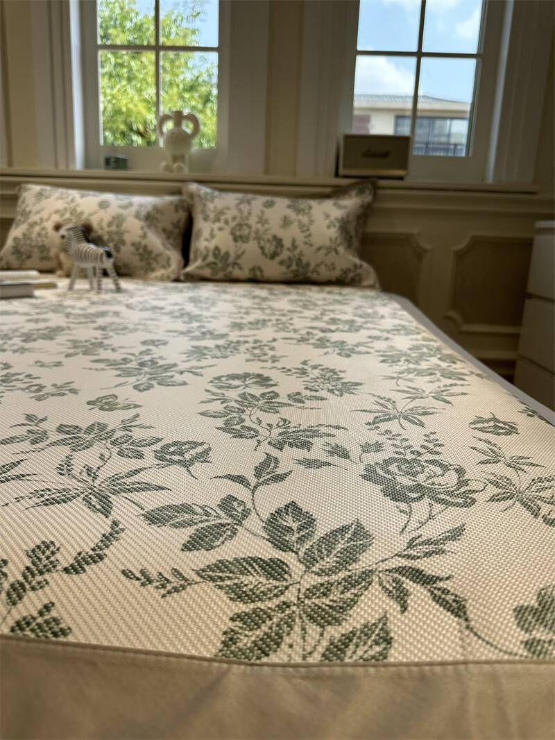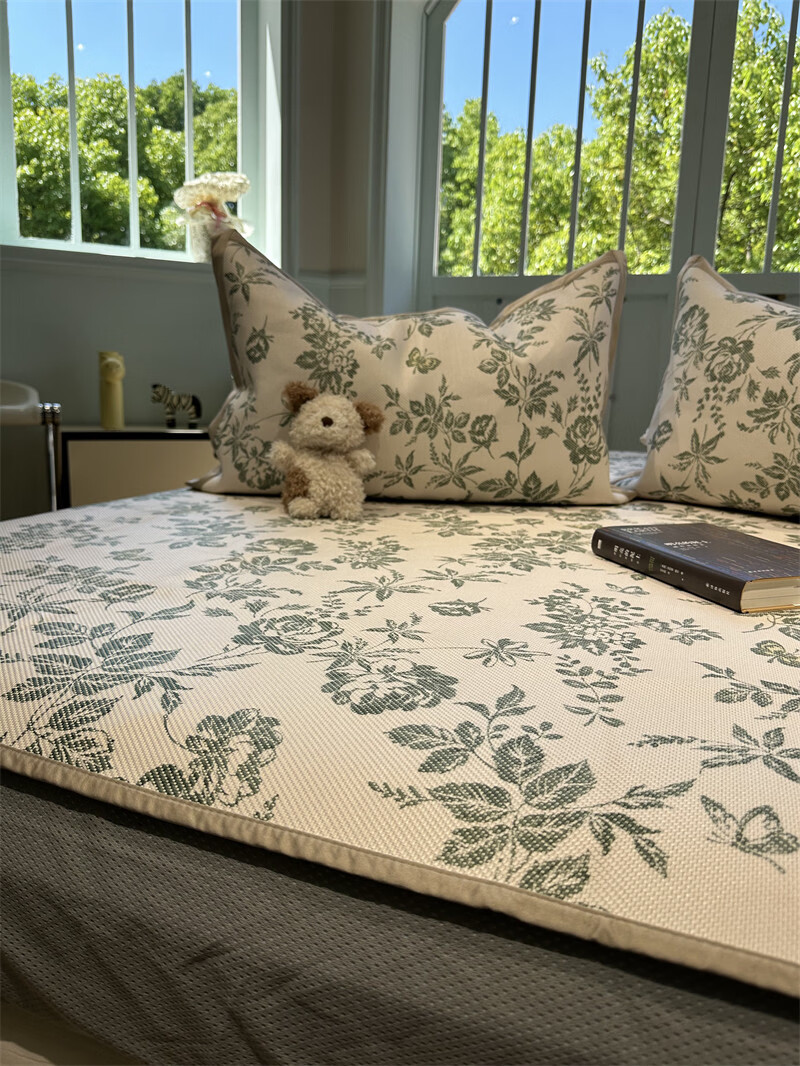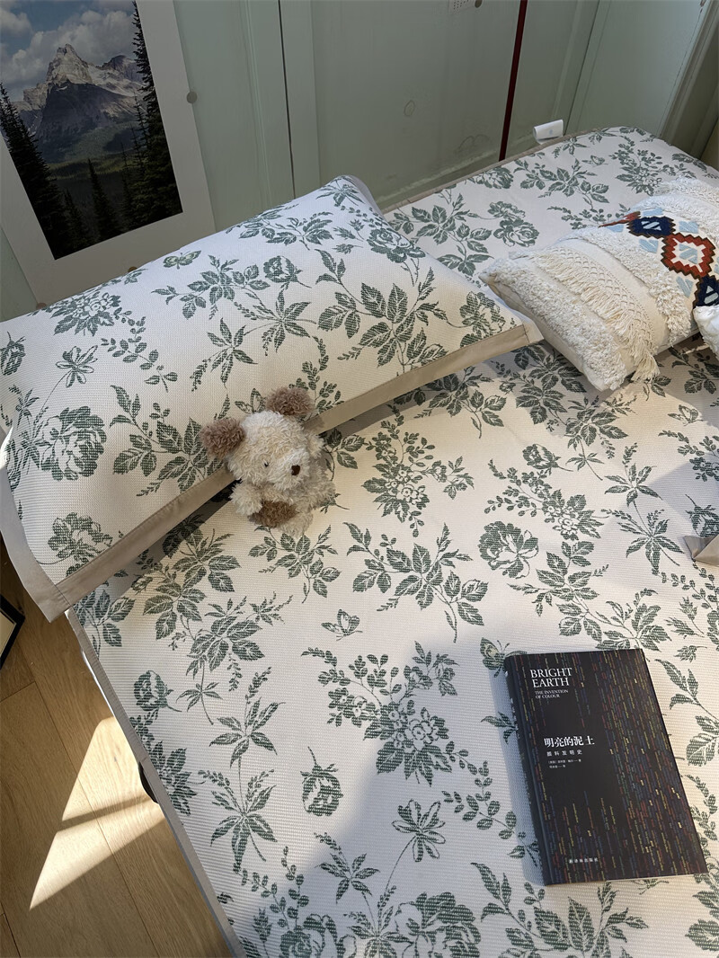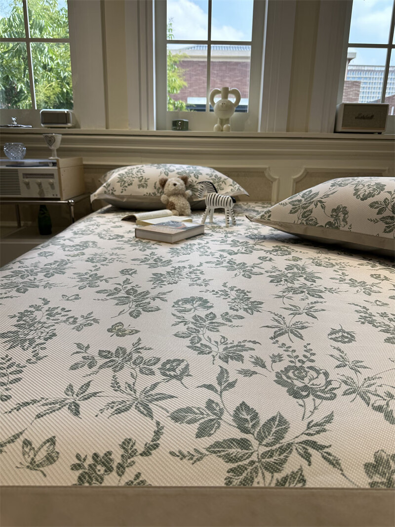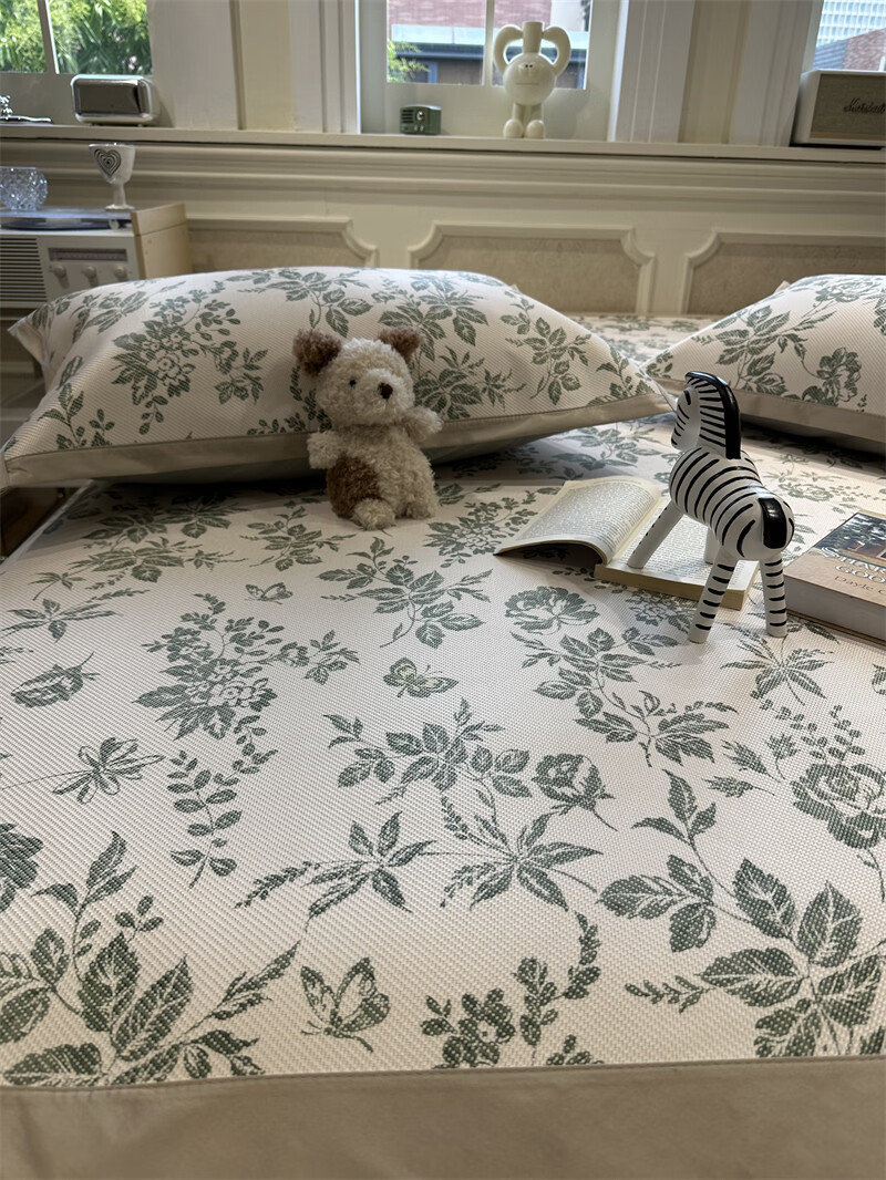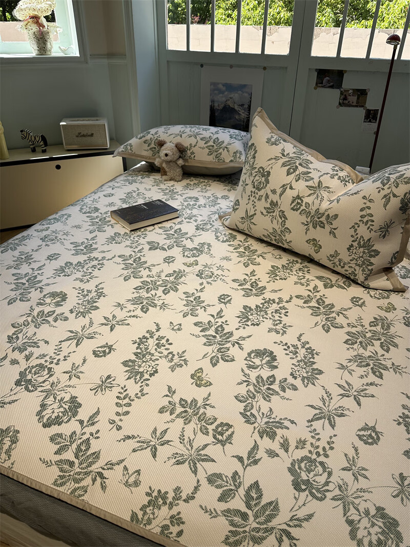 藤席天然纯藤冰法式茶歇绿色碎花可机洗夏凉席三件套空 YAG-冰藤席法式茶歇绿床笠款 1.8m(6英尺)床