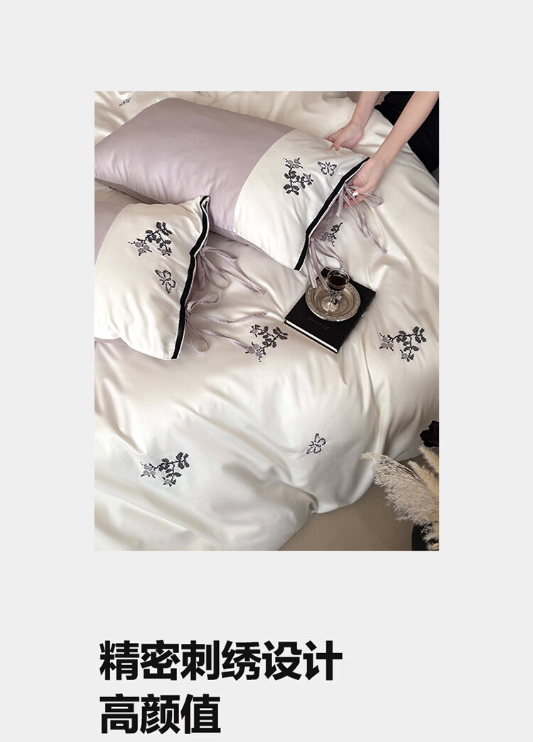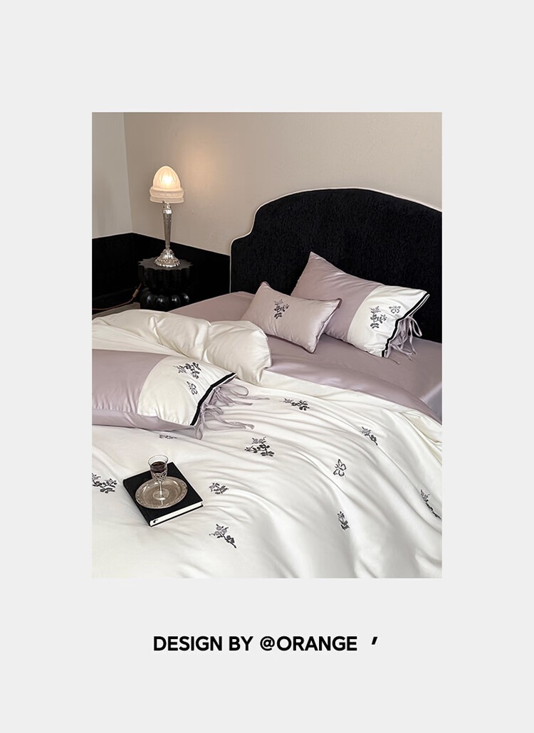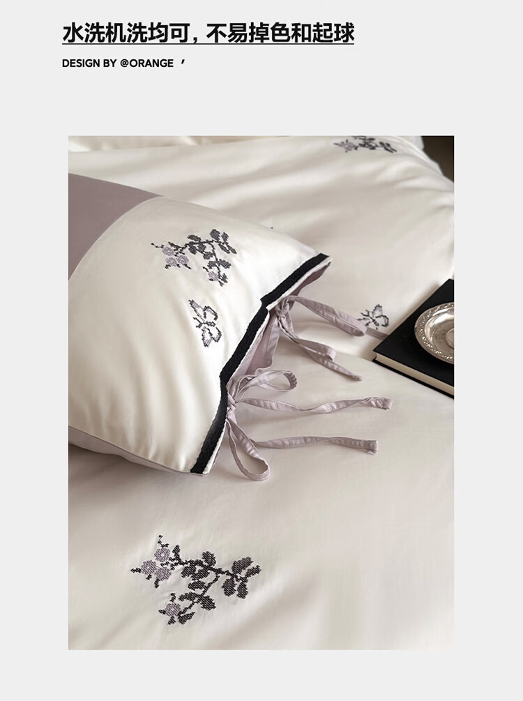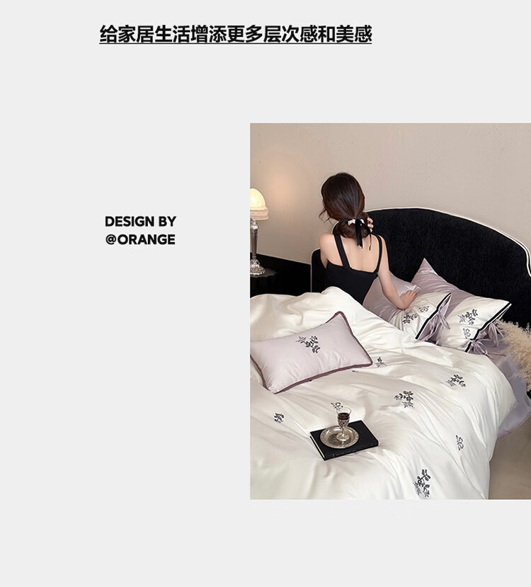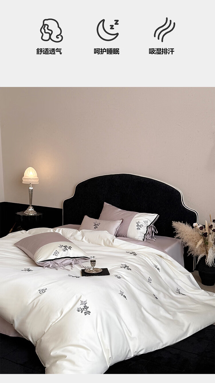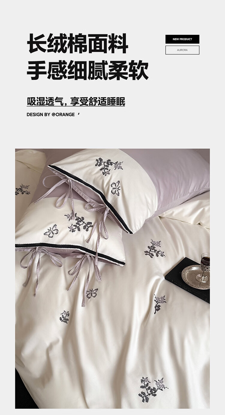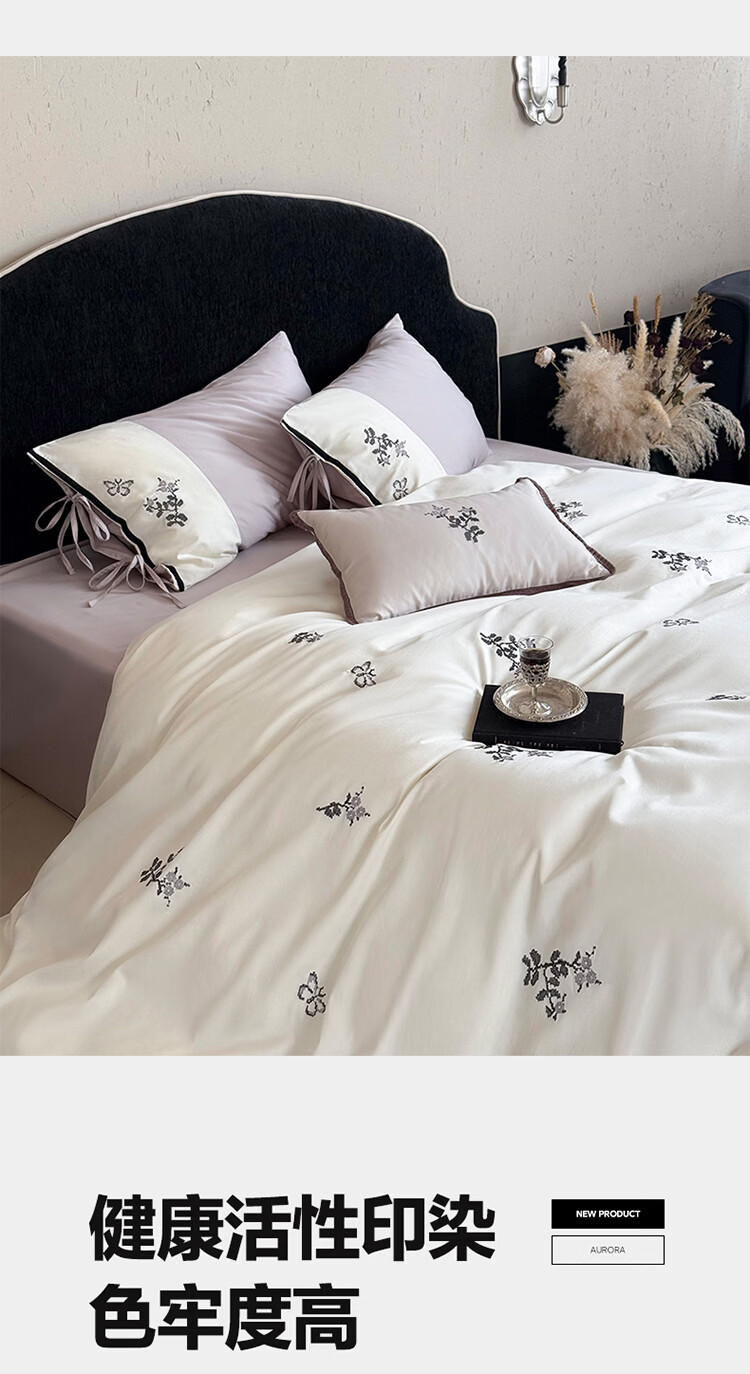 ROLAND LIVE长绒棉透气刺绣四件套亲肤裸睡被套床单1.8m床全棉四季床上用品 LB 长绒棉套件- 一隅花町 1.8米床 床单款 【被套200*230cm】