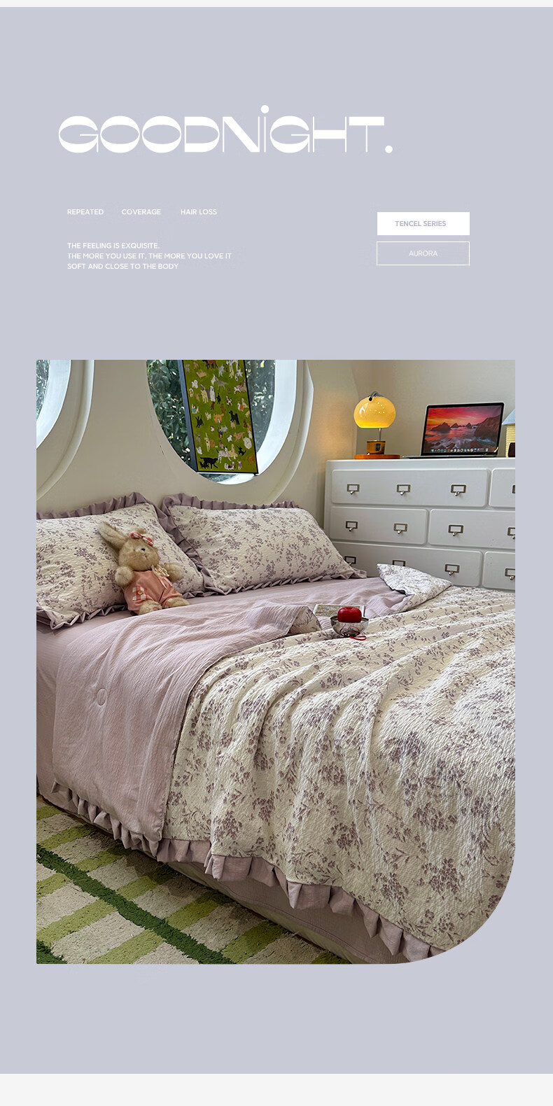 ROLAND LIVE天丝棉麻四件套春夏新款透气花朵刺绣被套床单家用卧室床上用品 KZ 天丝棉麻四件套-紫茉白 1.8米床 床笠款 【被套200*230cm】
