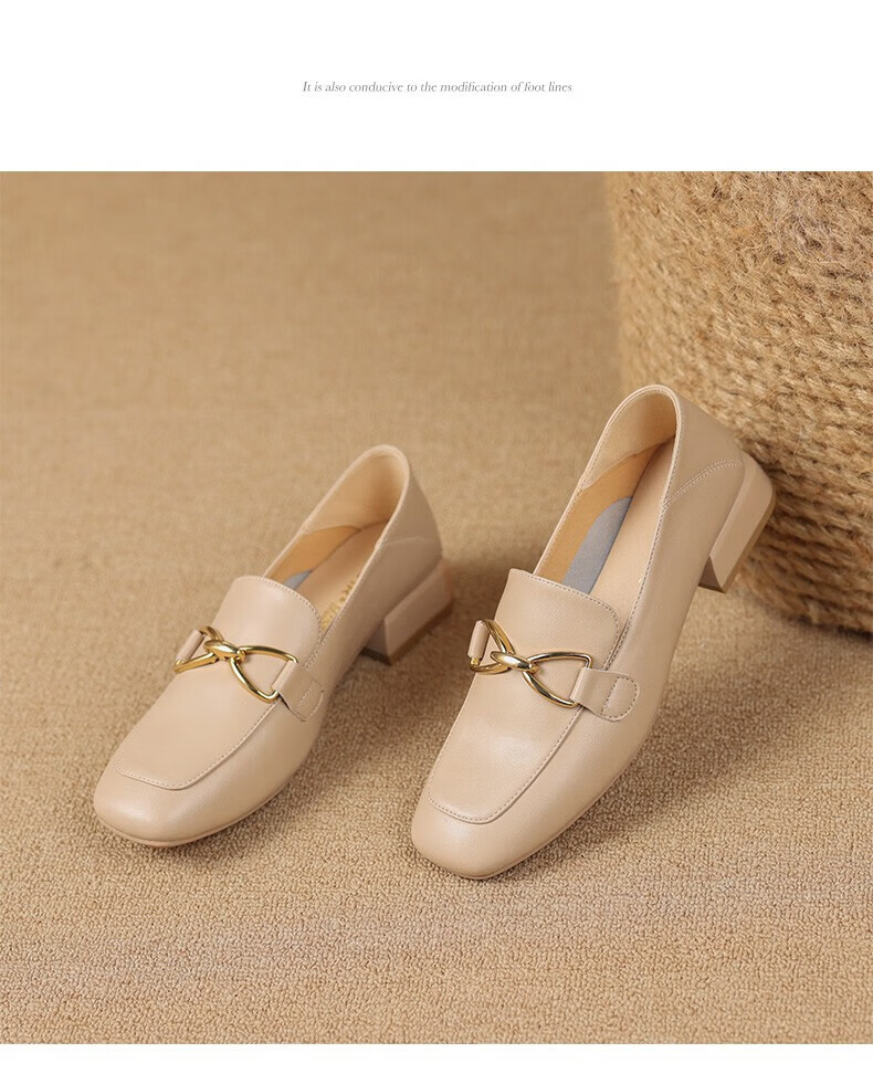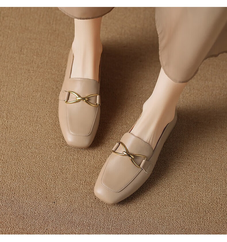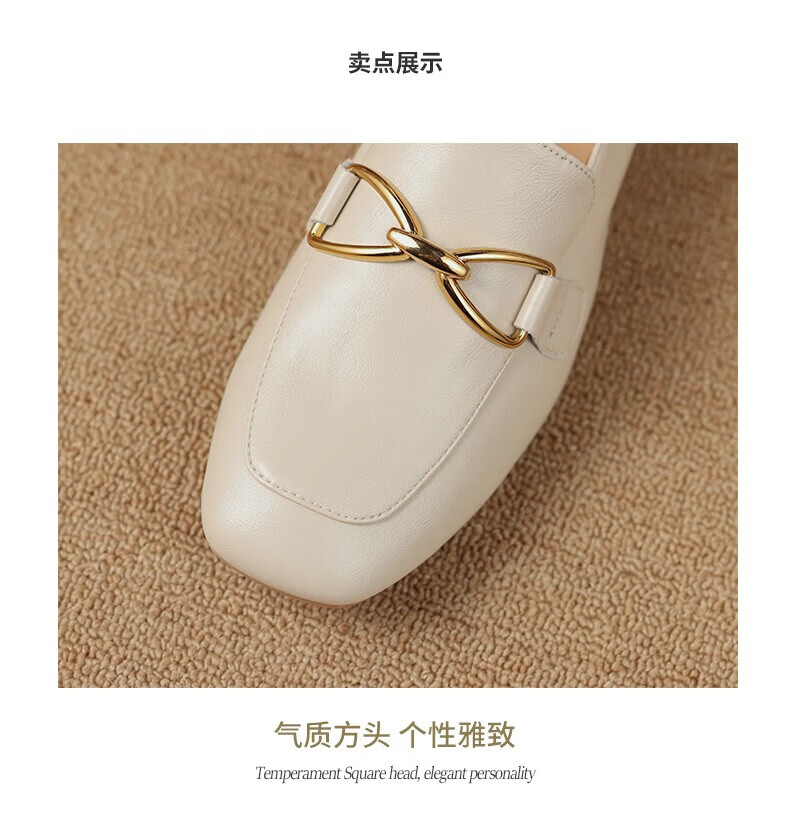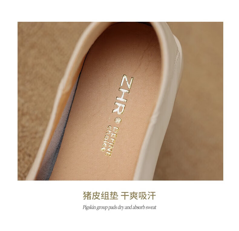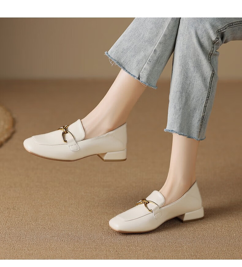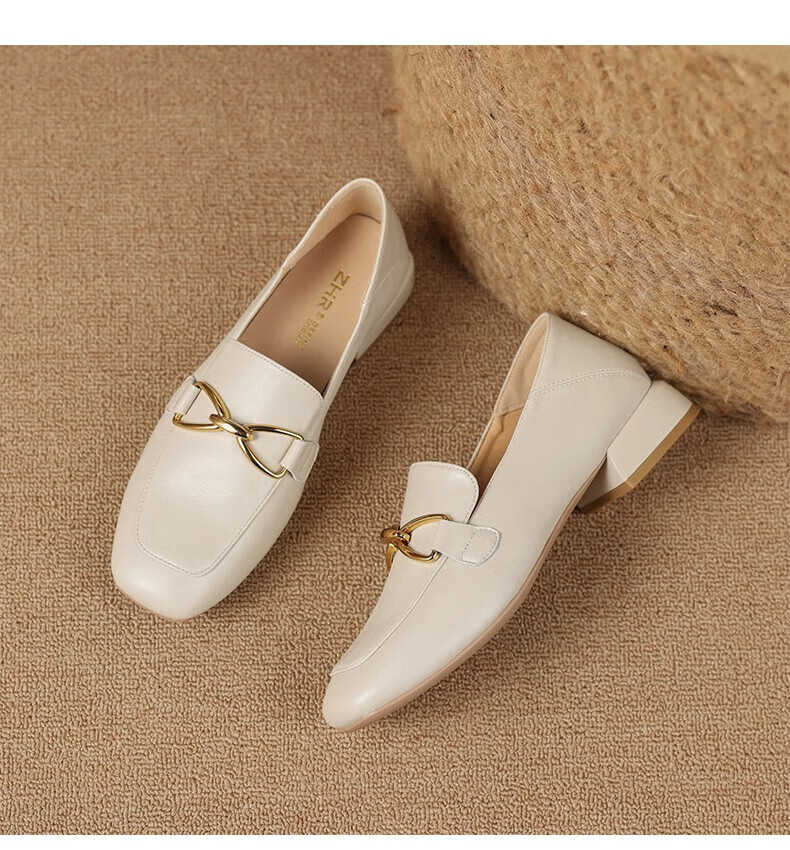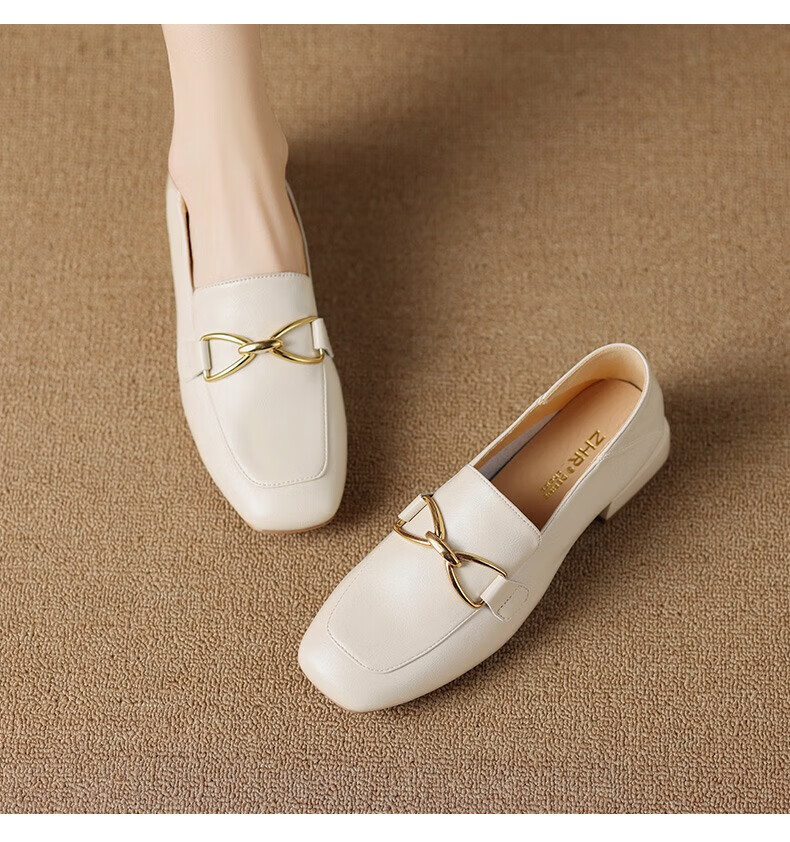 ZHR则则单鞋女秋季新品蝴蝶结金属饰扣休闲鞋子女百搭真牛皮透气舒适 米色 37
