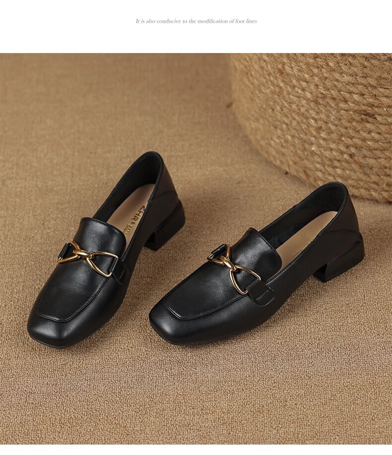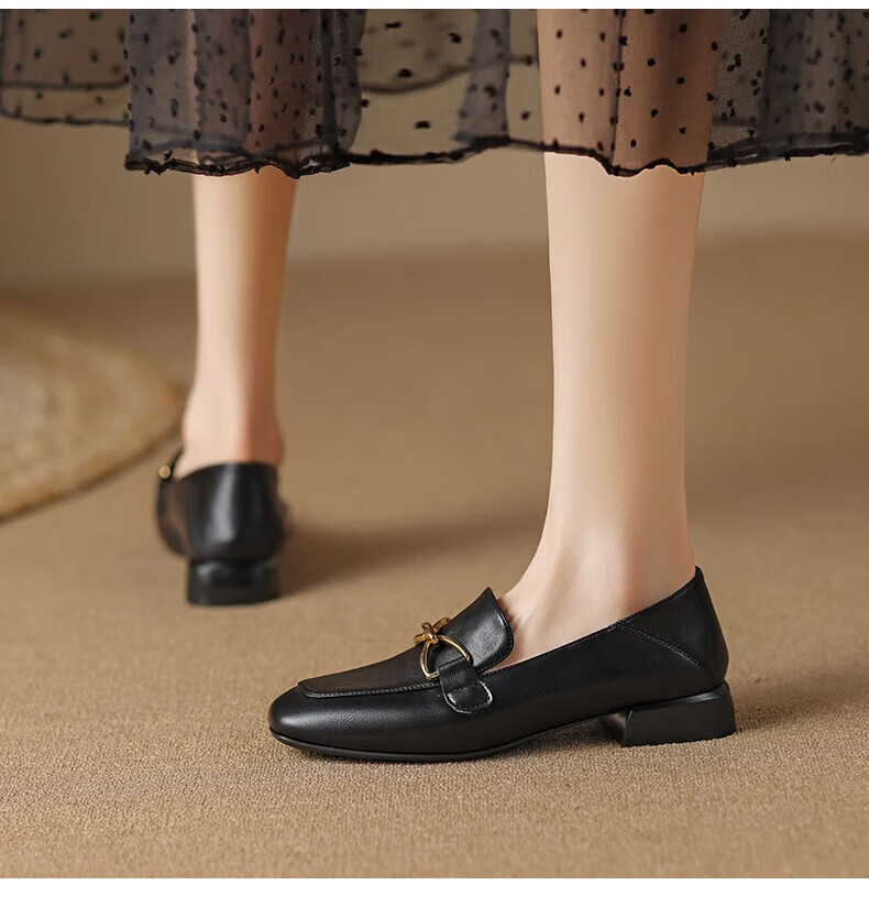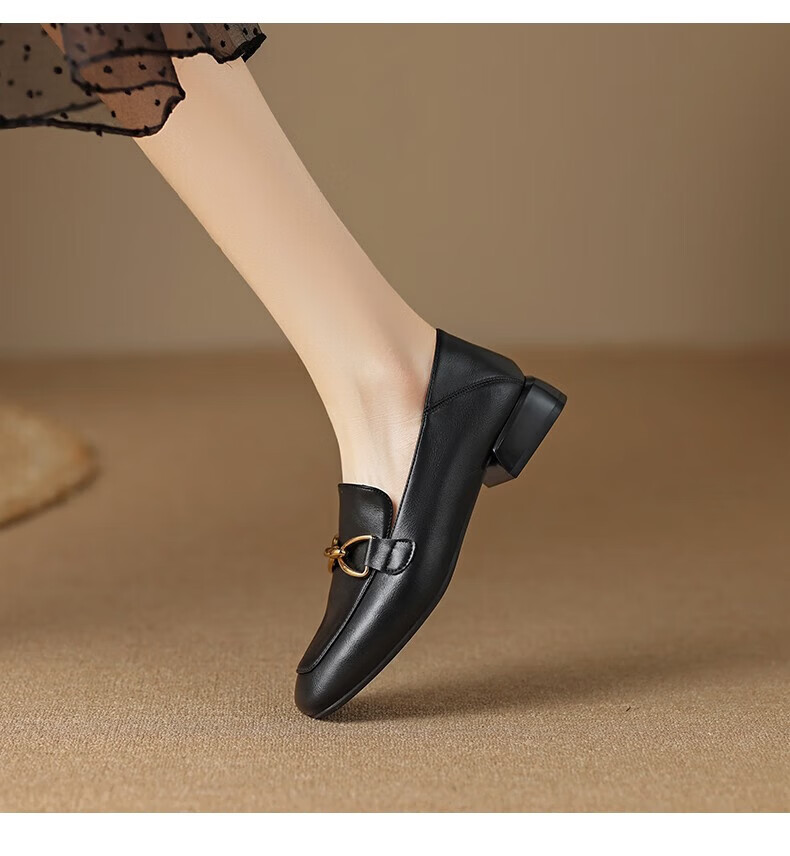 红蜻蜓单鞋女头层牛皮小皮鞋英伦休闲鞋女通勤粗跟女鞋WTB152651黑色39