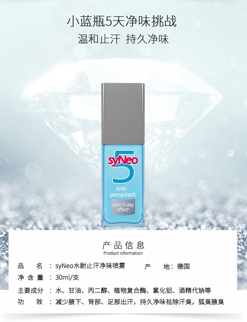 syneo水耐德国止汗露 祛味除狐臭/腋臭/汗臭(男女专用腋下除臭止汗) 通用止汗喷雾30ml