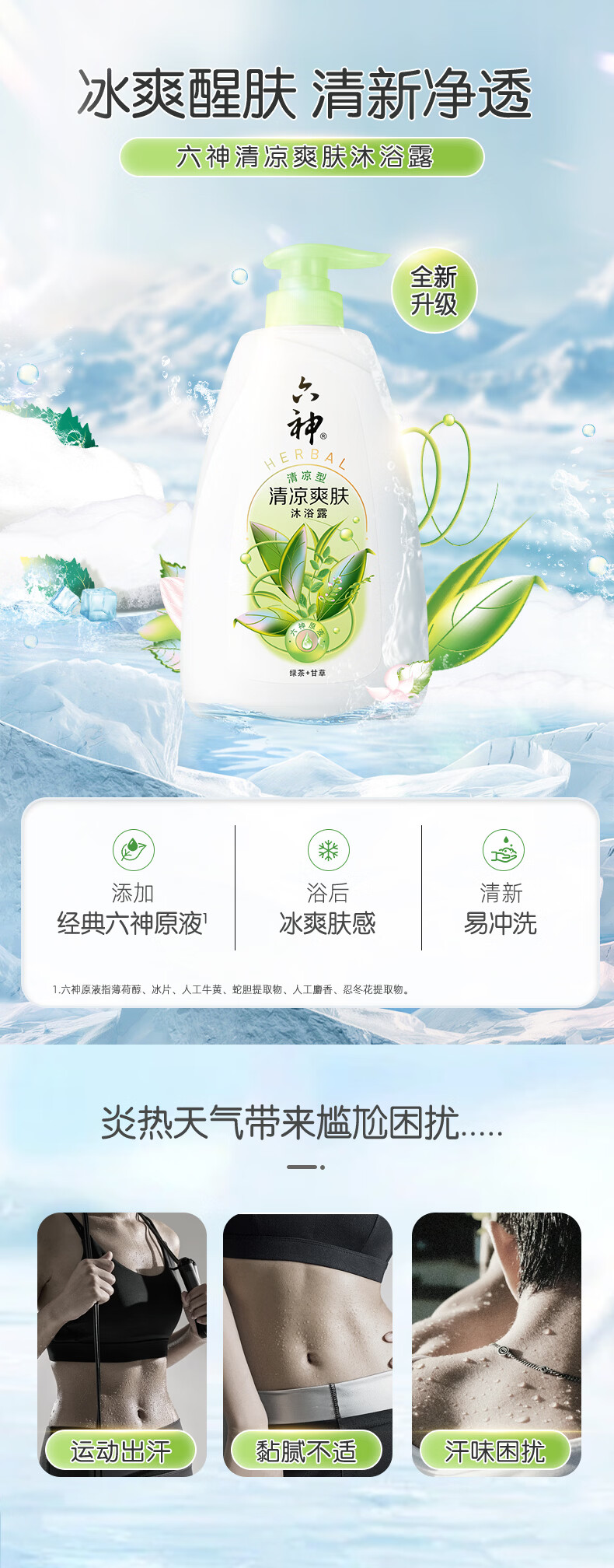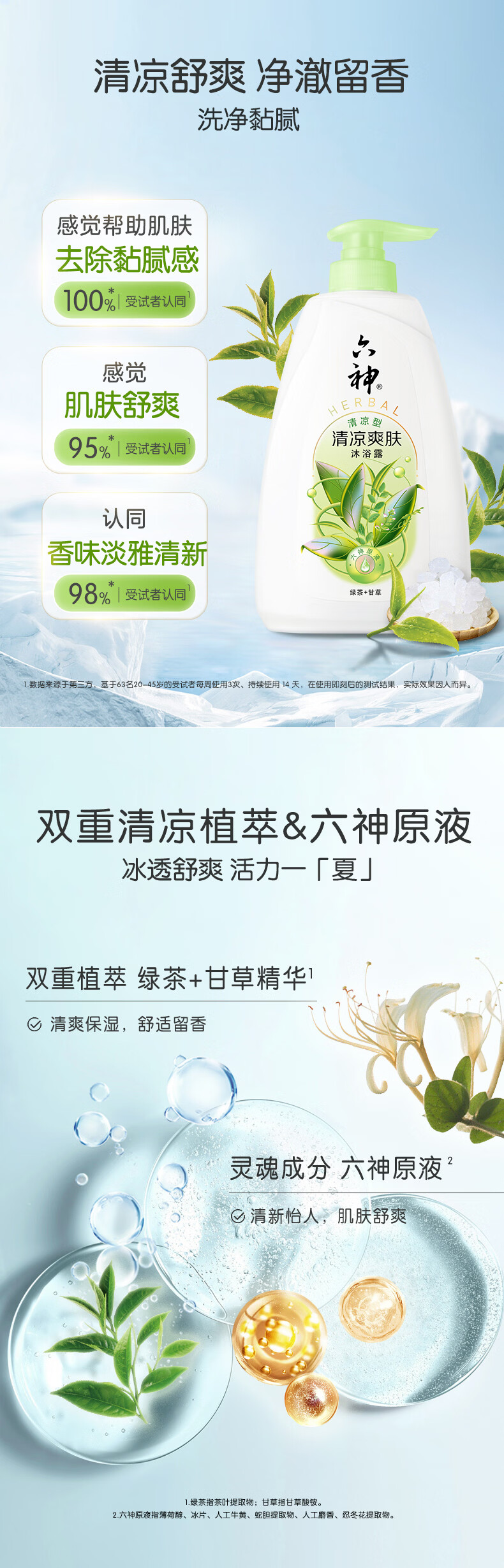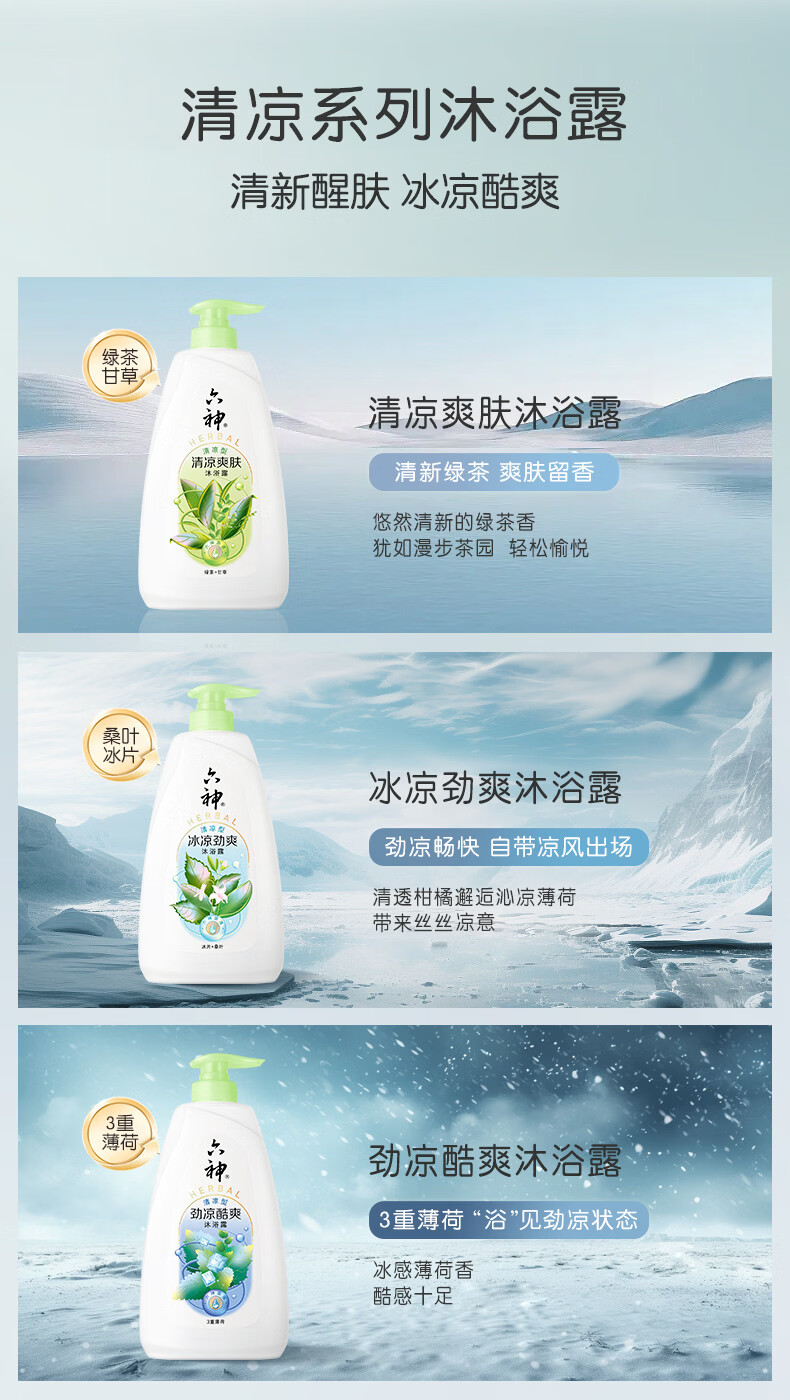 六神清凉爽肤沐浴露清爽控油持久留香男女家庭【绿茶+甘草】 清凉爽肤650g+180g