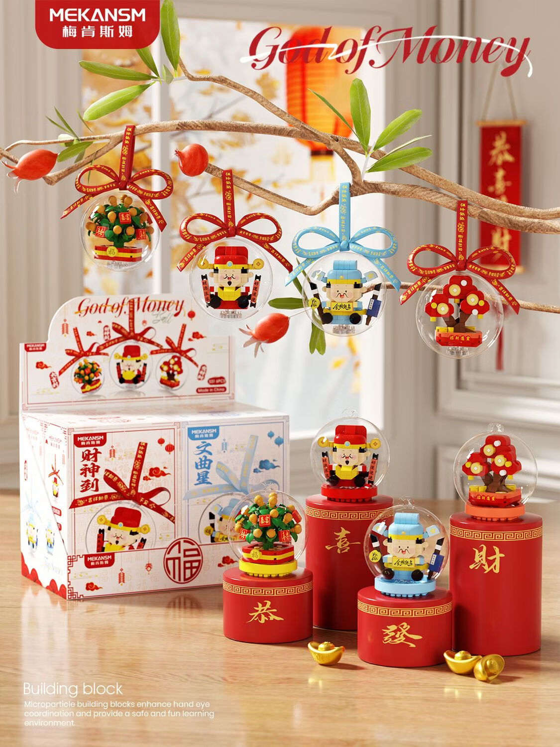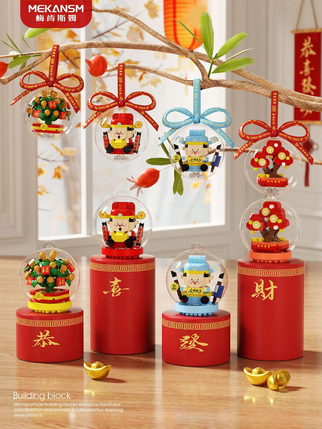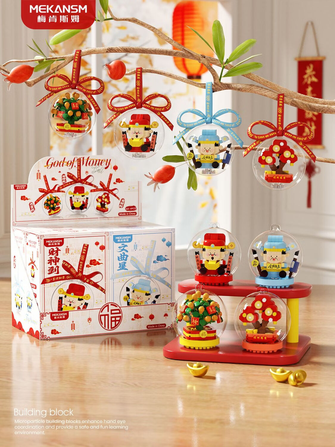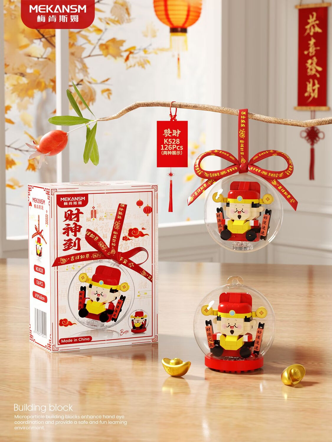 奇优宝2026马年祥瑞福运积木财神爷发财橘子树水晶球摆挂件玩具新年礼物 文曲星带透明球133颗粒【两种拼发】