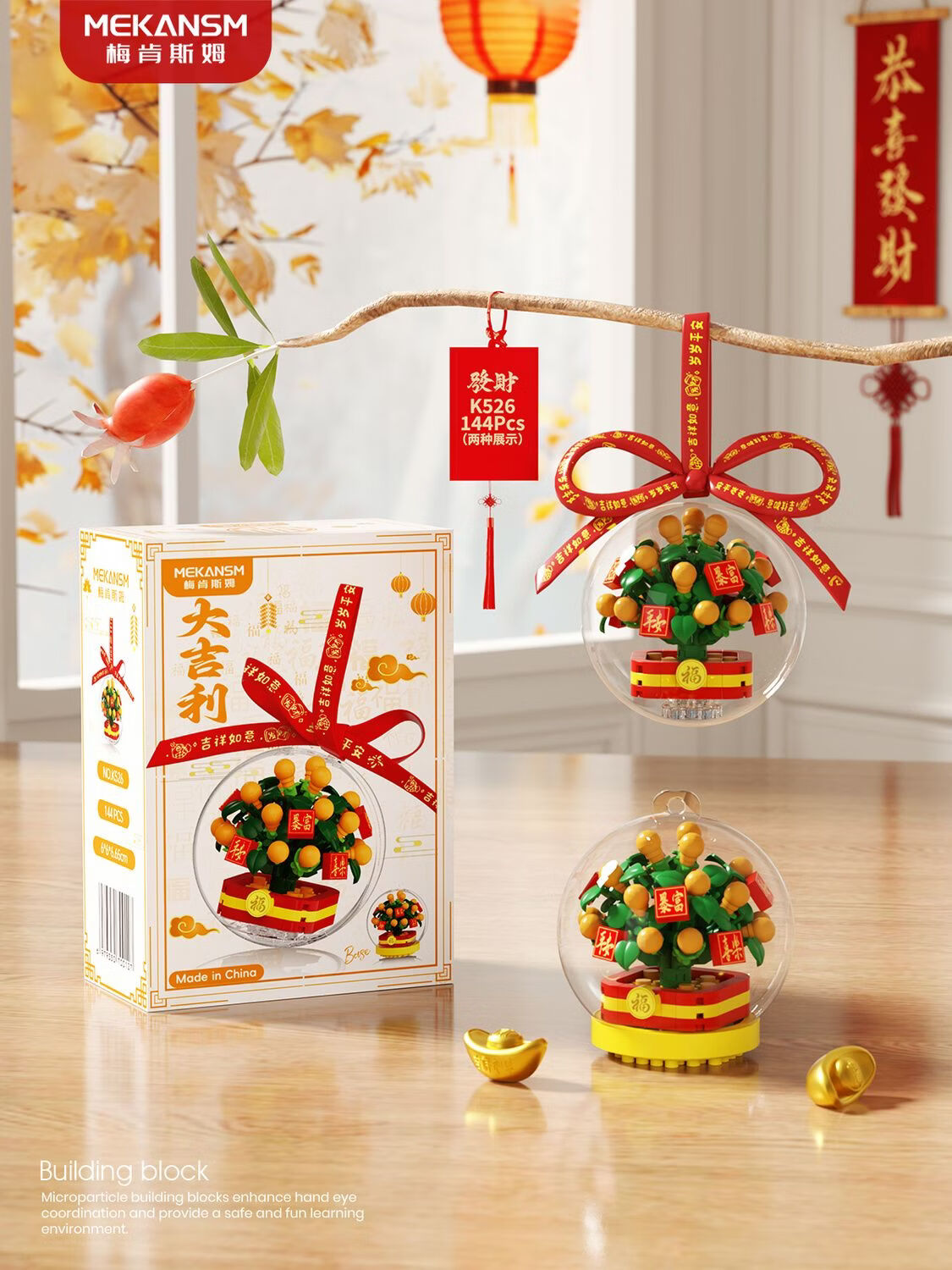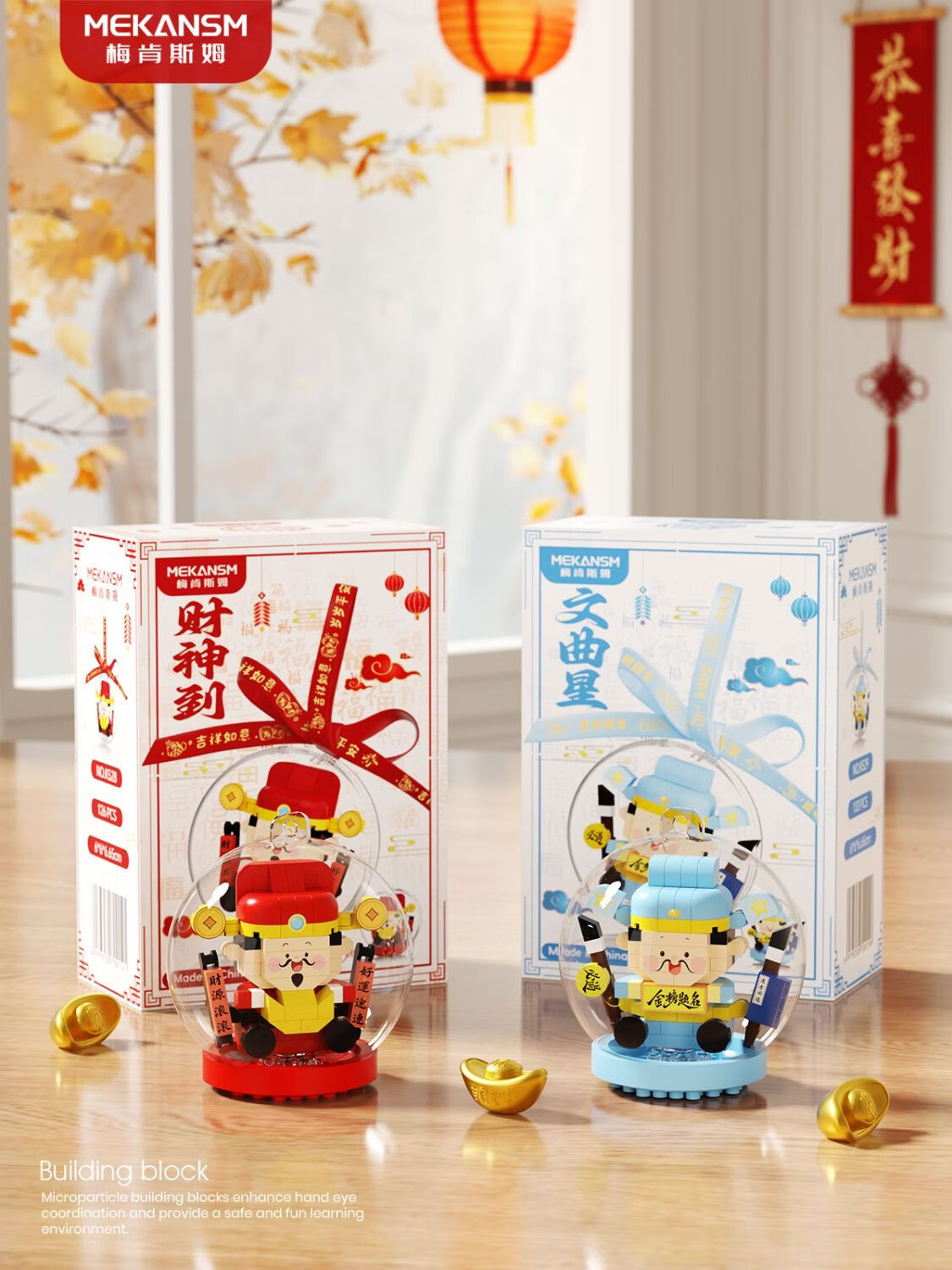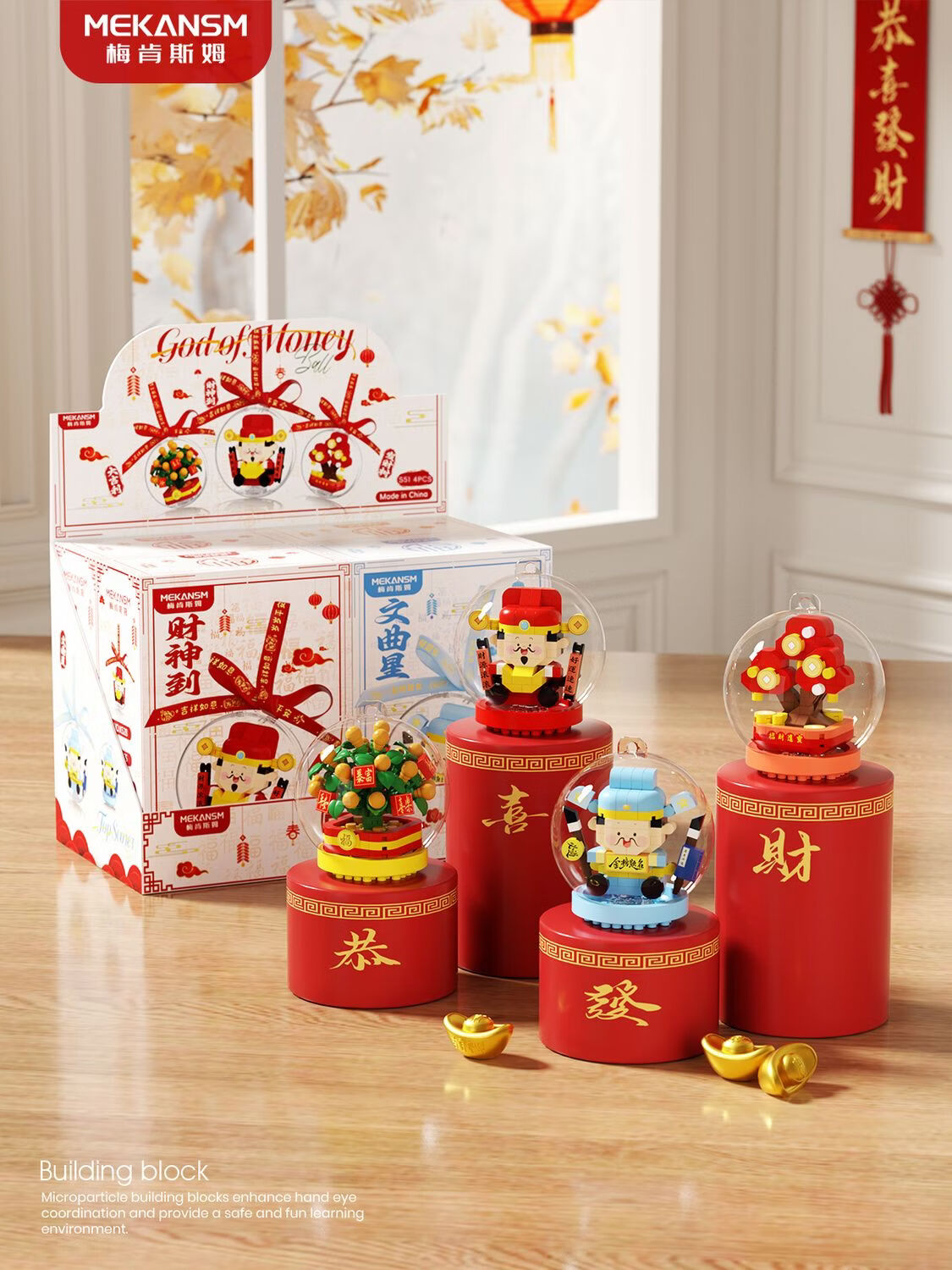奇优宝2026马年祥瑞福运积木财神爷发财橘子树水晶球摆挂件玩具新年礼物 文曲星带透明球133颗粒【两种拼发】