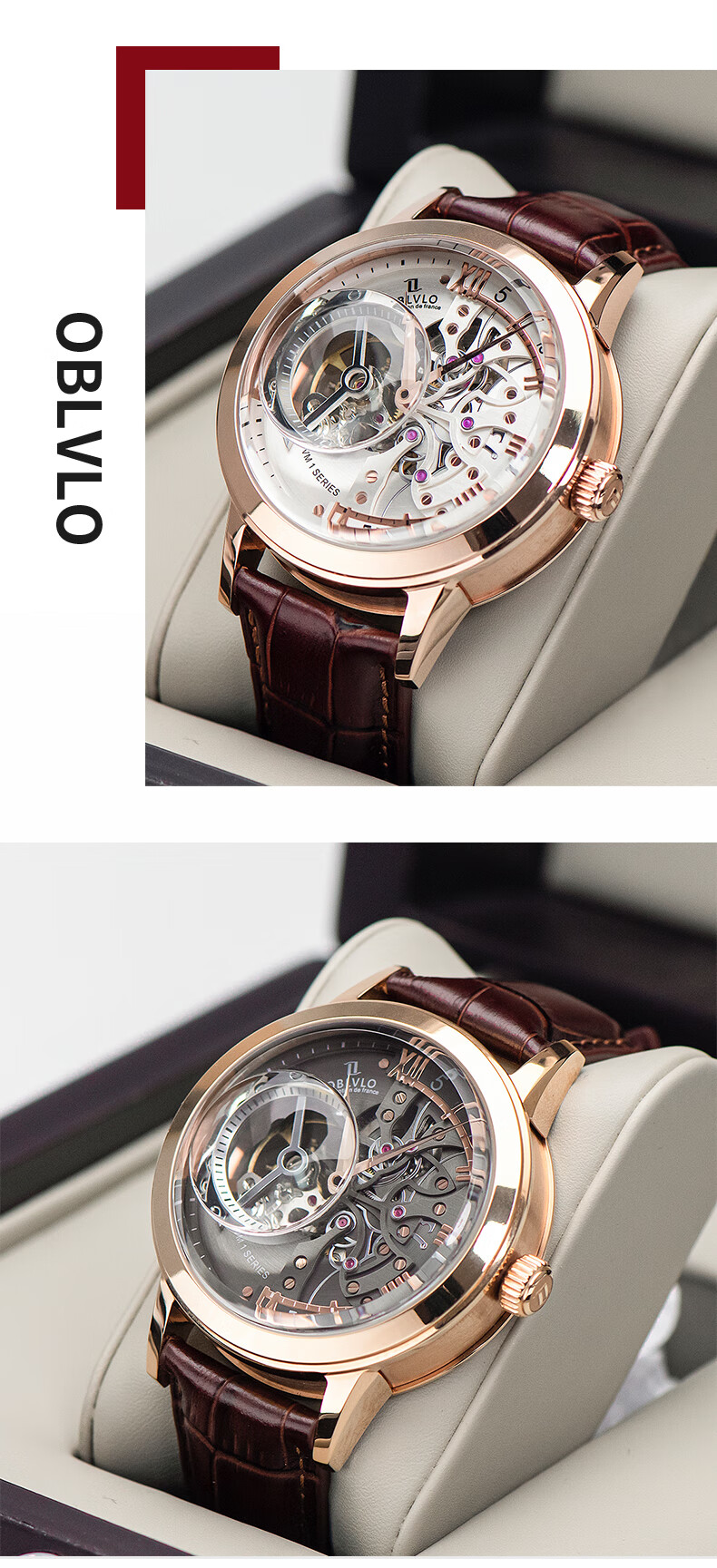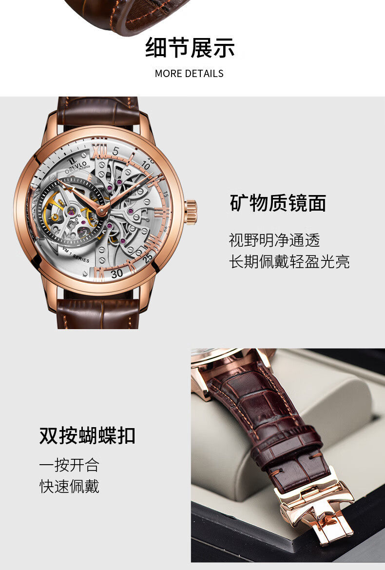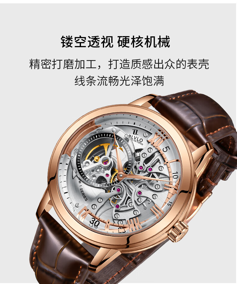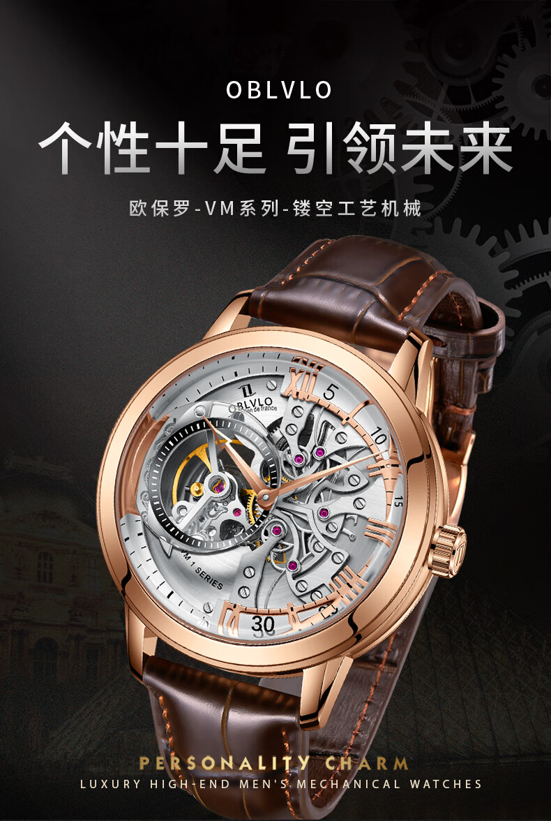 欧宝罗(OBLVLO)法国OBL全自动镂空机械表男十大品牌镂空手表运动复古男士 白壳白面黑带
