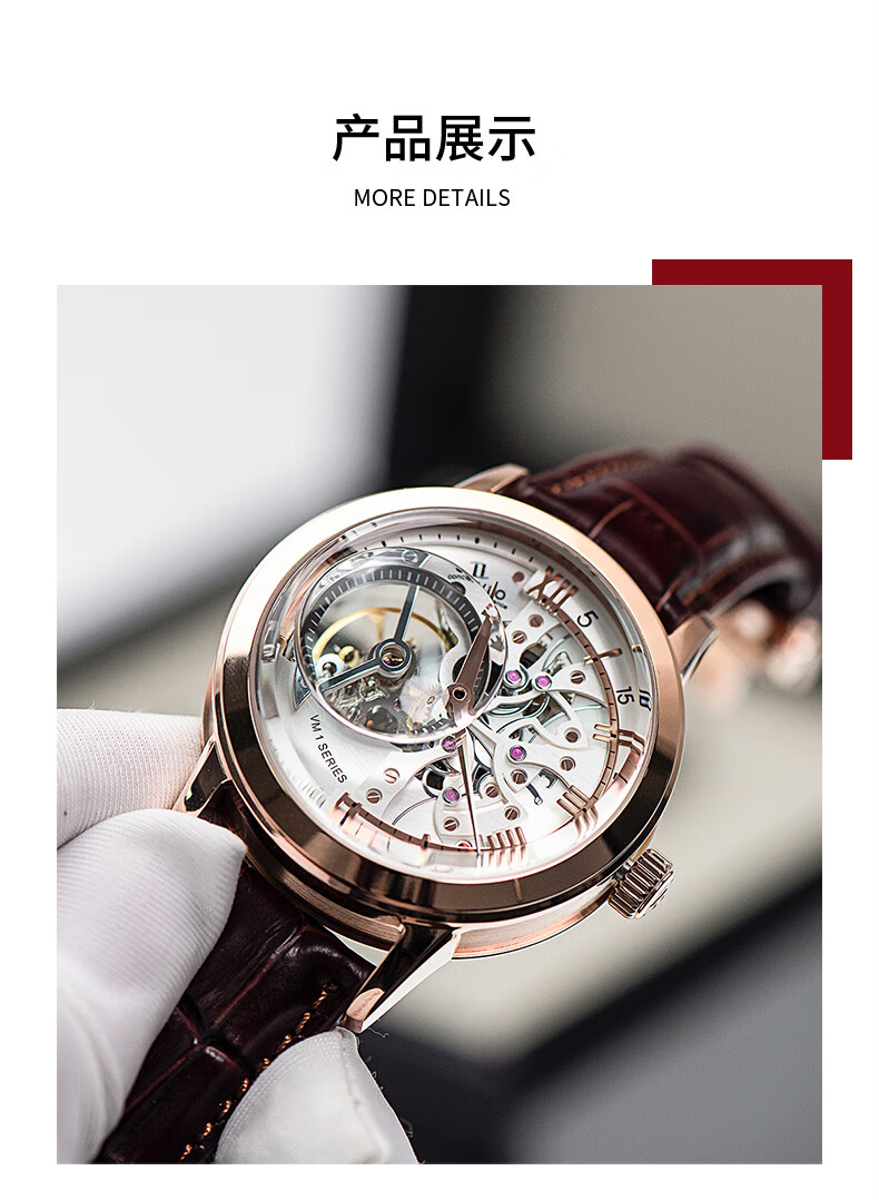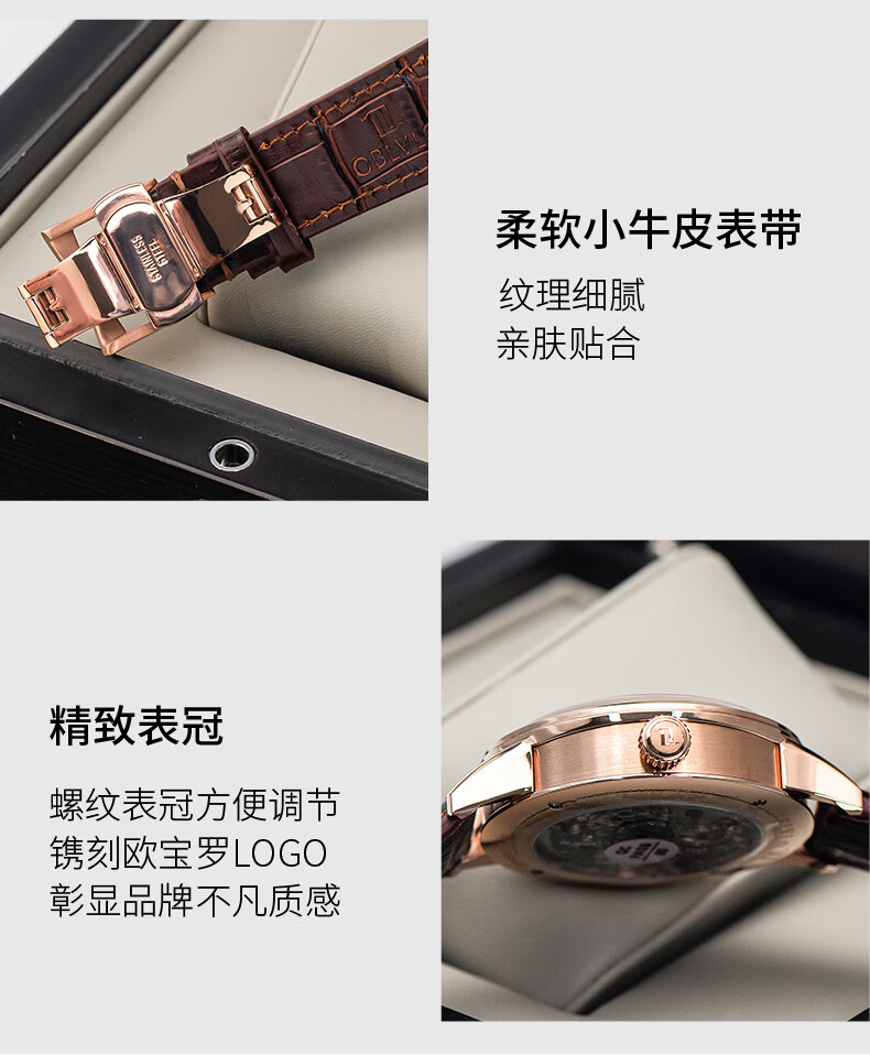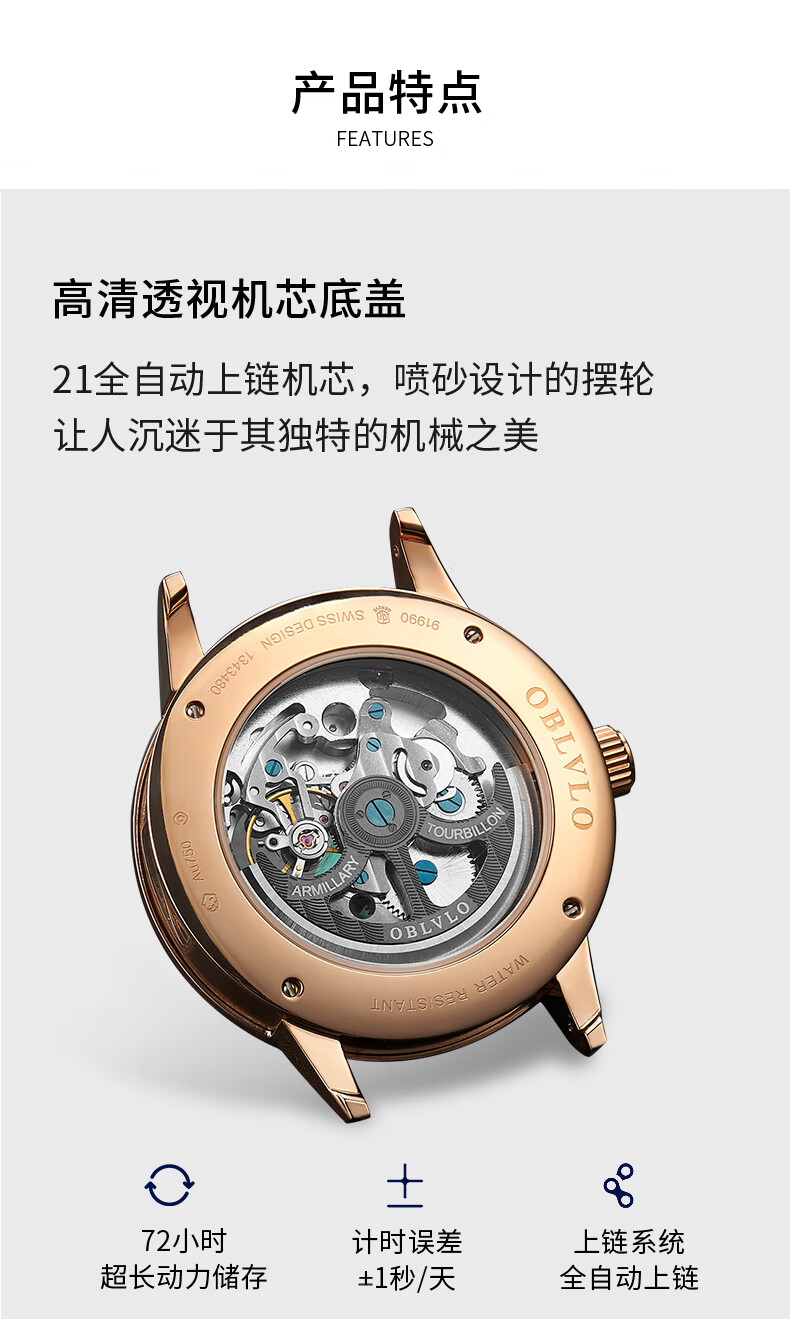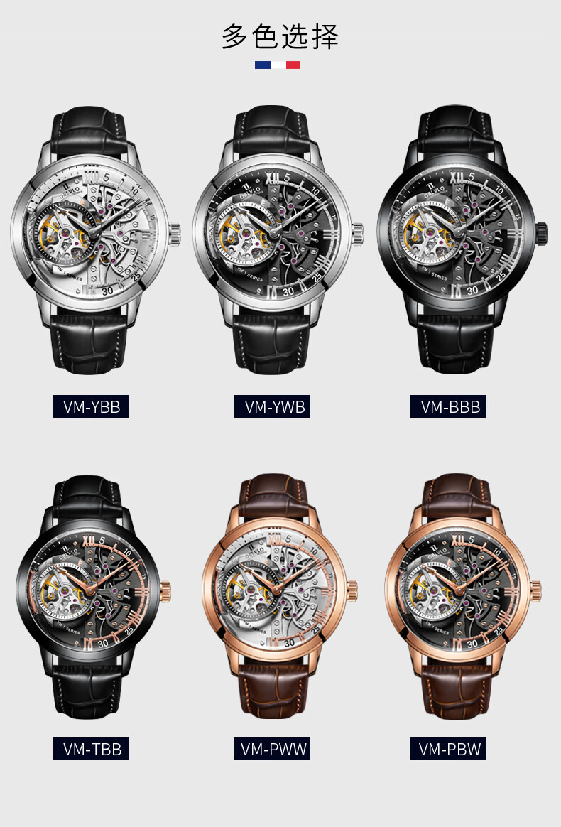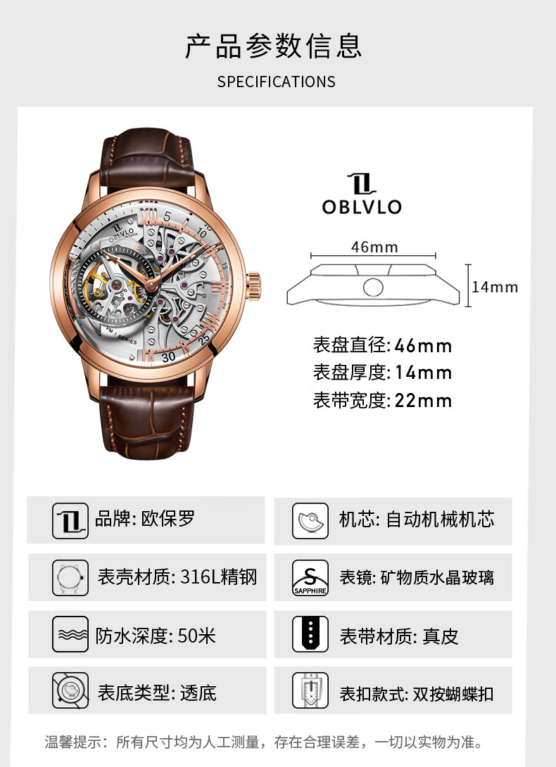 欧宝罗(OBLVLO)法国OBL全自动镂空机械表男十大品牌镂空手表运动复古男士 白壳白面黑带