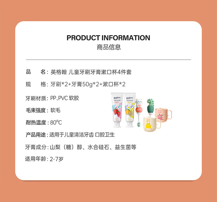 英格翰儿童牙膏含氟防蛀天然木糖醇宝宝牙膏2-12岁牙膏套装杯子随机发 牙刷2支+牙膏2支+杯2(2-12岁)