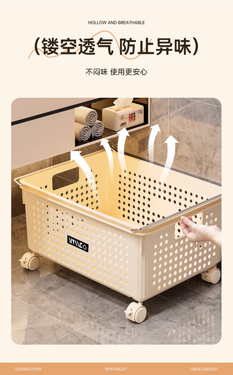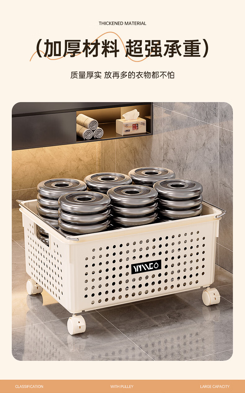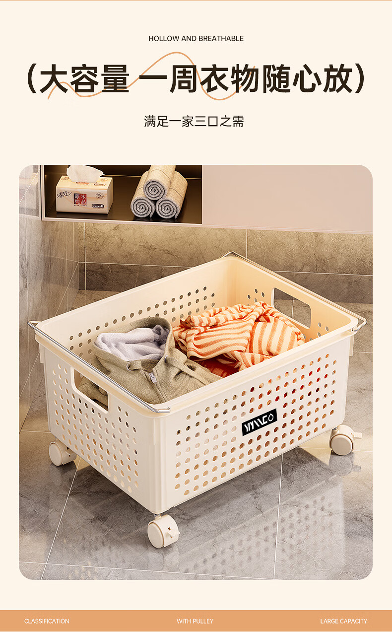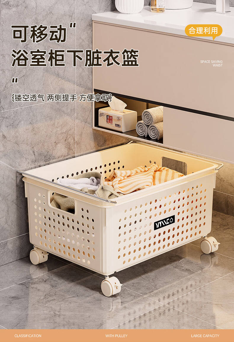 稻草熊家用脏衣篮浴室柜下脏衣篓带轮脏衣收纳提篮【新家的100个快递】 中号【加厚升级*加大容量*万向滑轮】