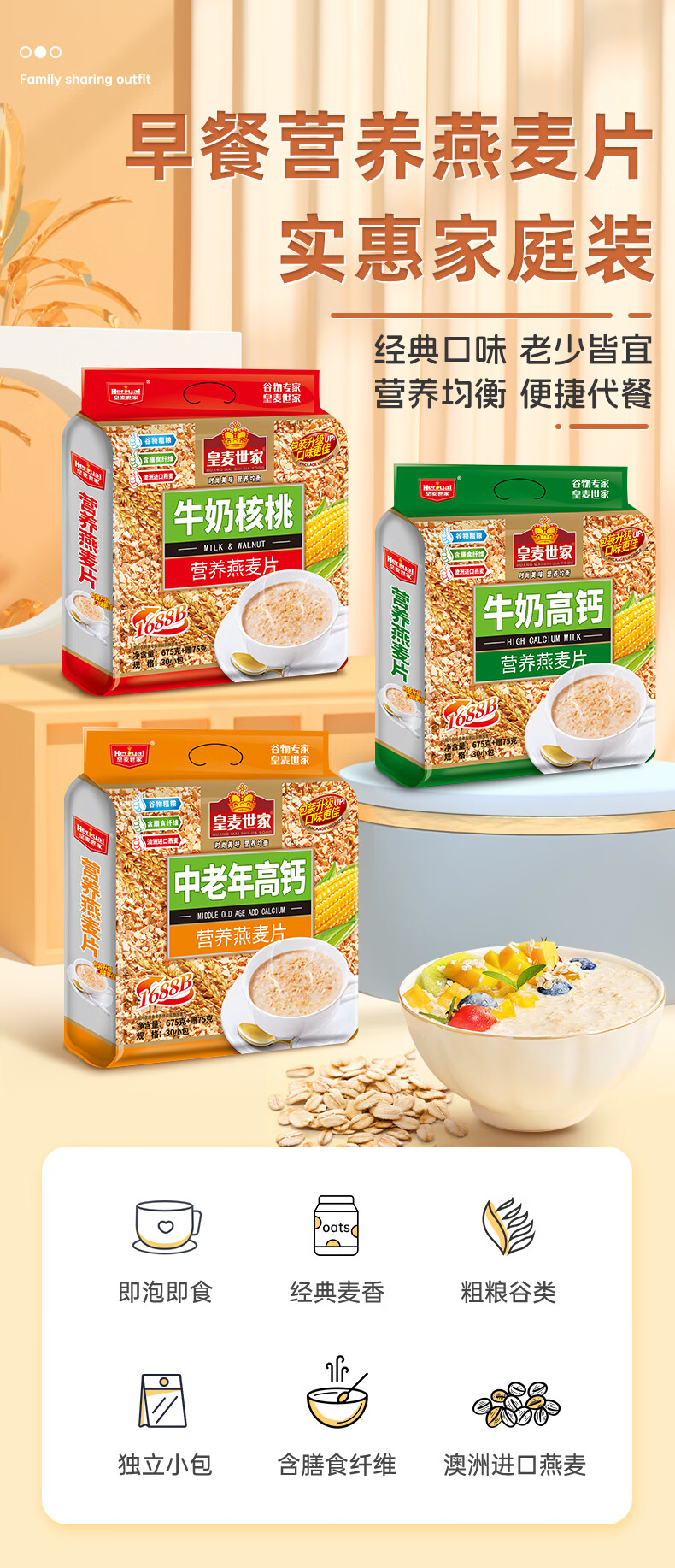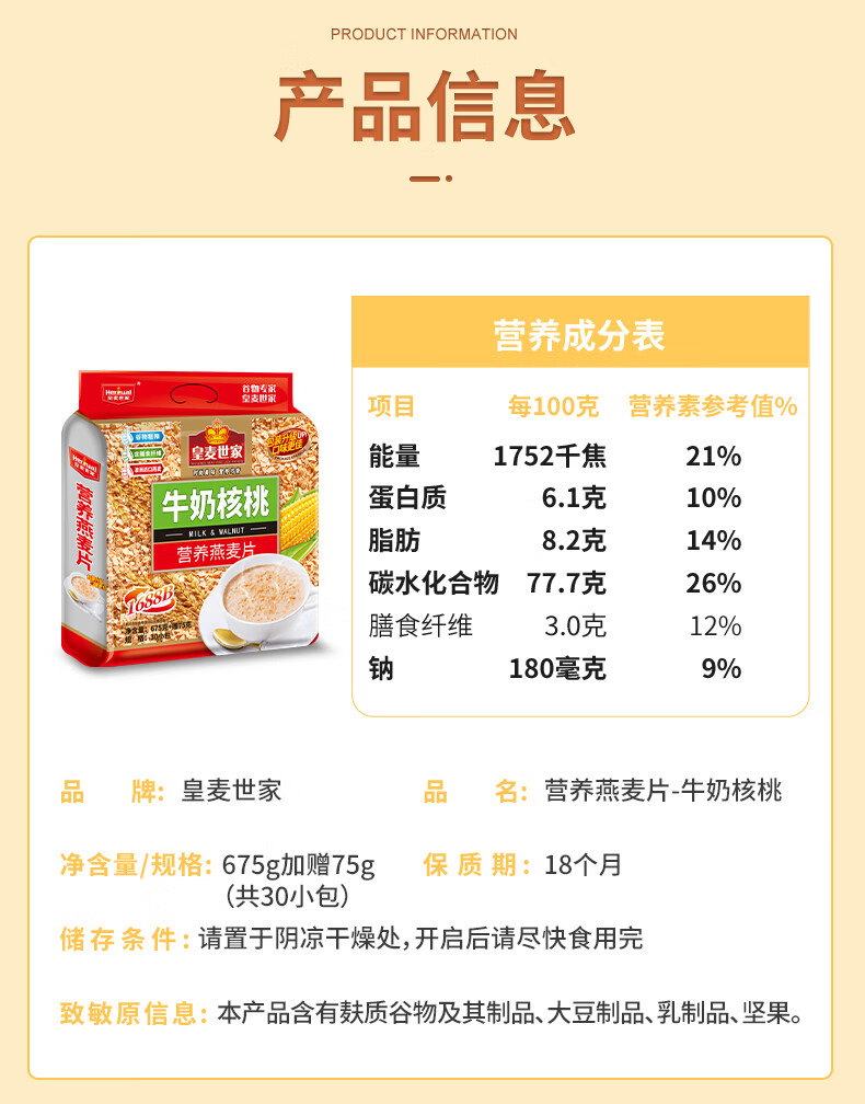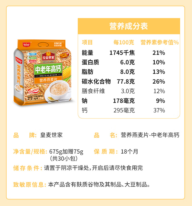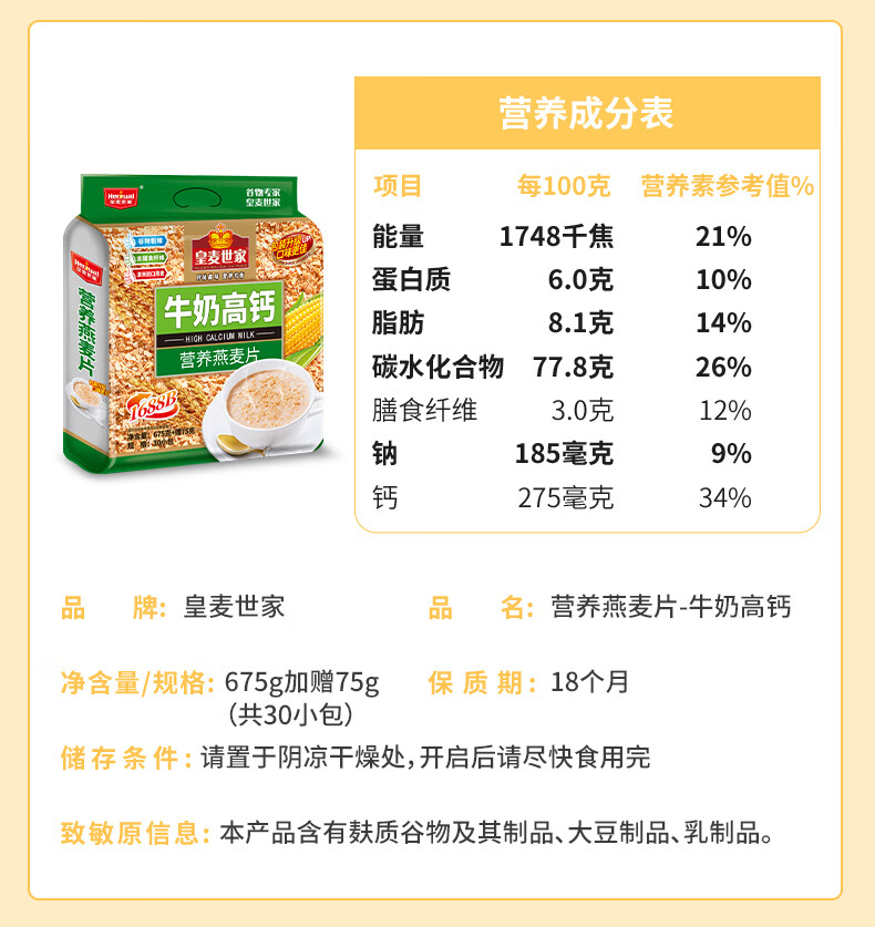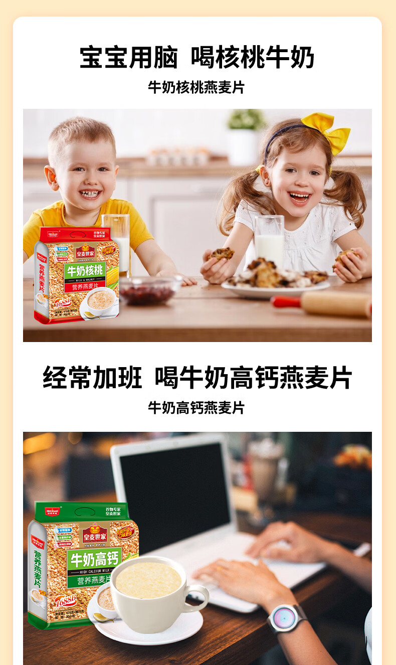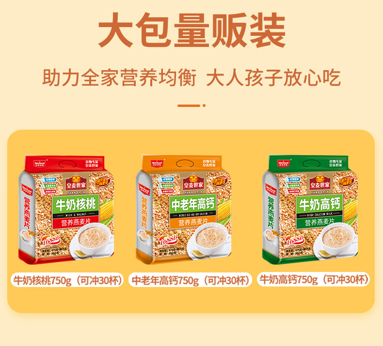 皇麦世家牛奶高钙纯燕麦片750g(30小包) 早餐代餐免煮即食 独立小包装