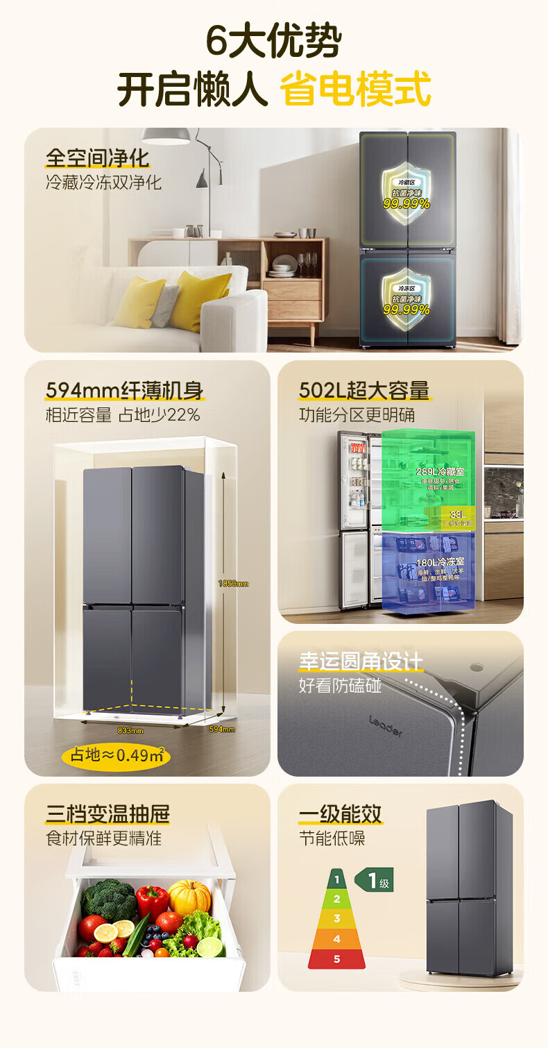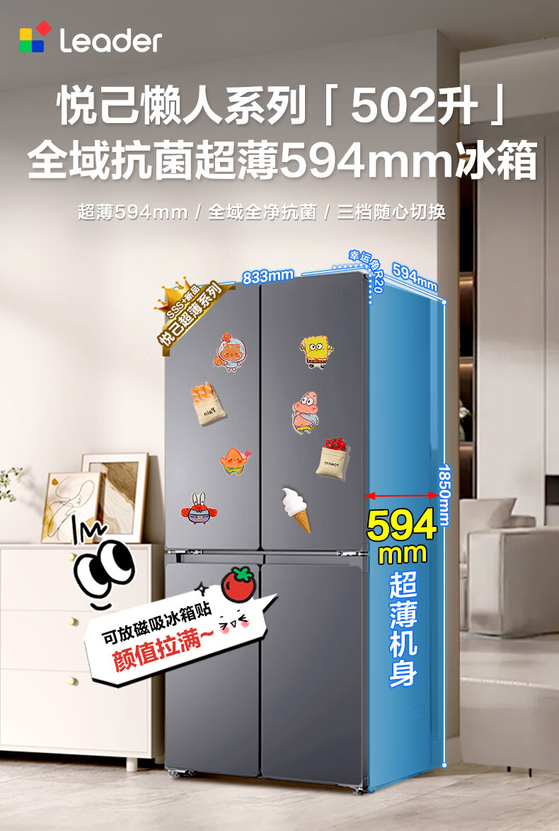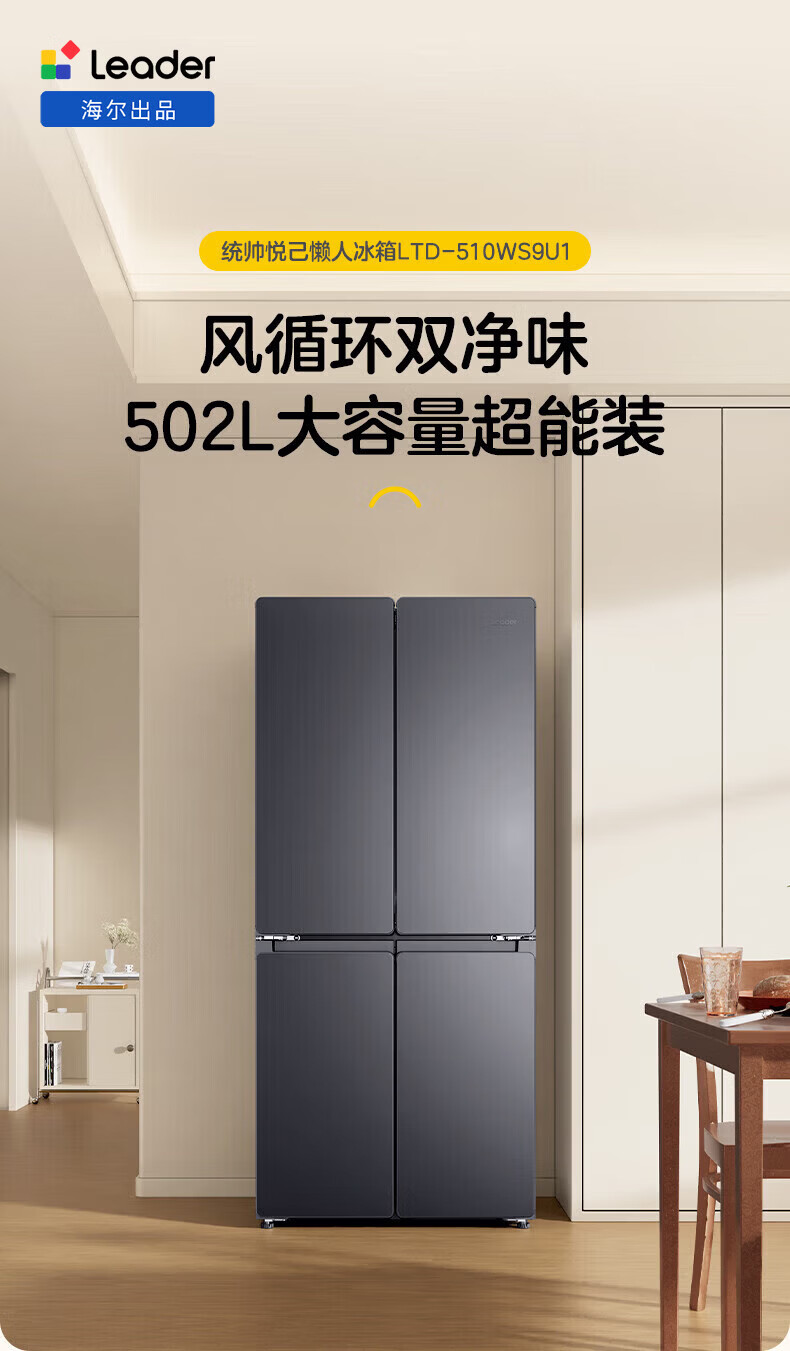 Leader冰箱出品统帅502升四开门十字对开门懒人系列510超薄全域双净化家用风冷无霜大容量电冰箱以旧换新 594mm薄机身+全域自然净+三档变温