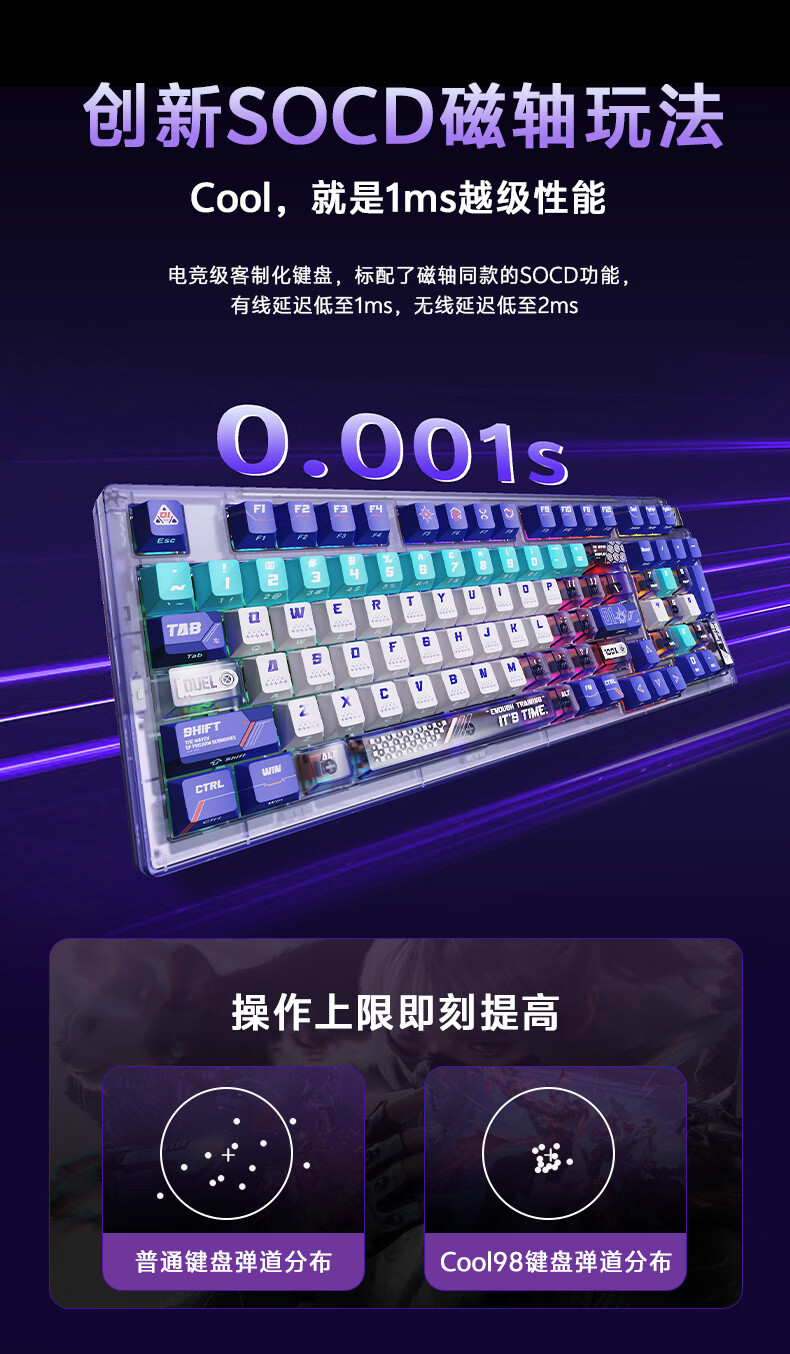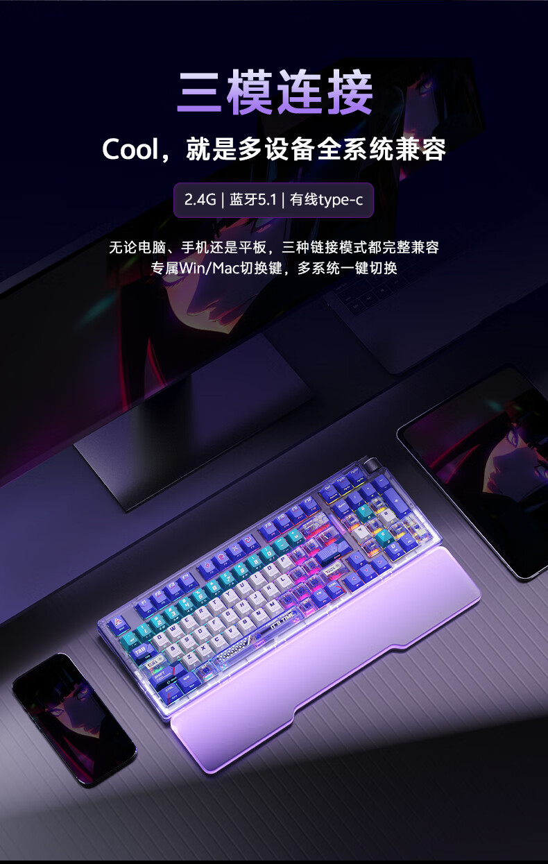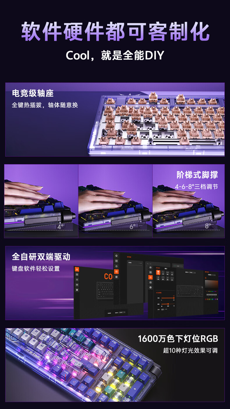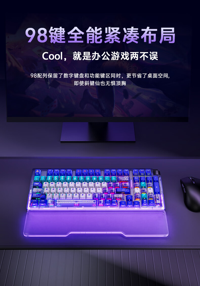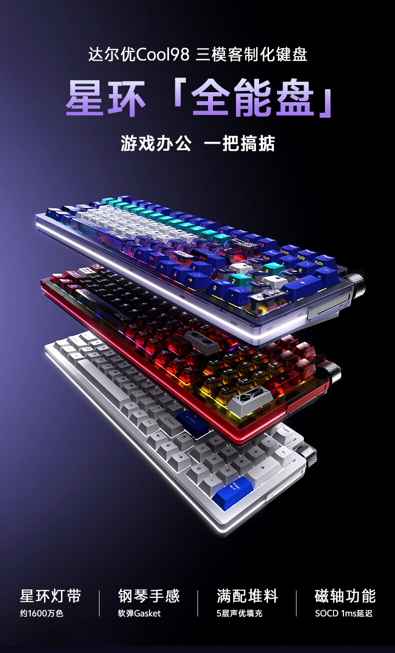 达尔优Cool98 电竞游戏机械键盘客制化三模无线星环灯带透明键盘三角洲无畏契约FPS网页双驱动全键热插拔 动力紫(桃C拿铁轴)