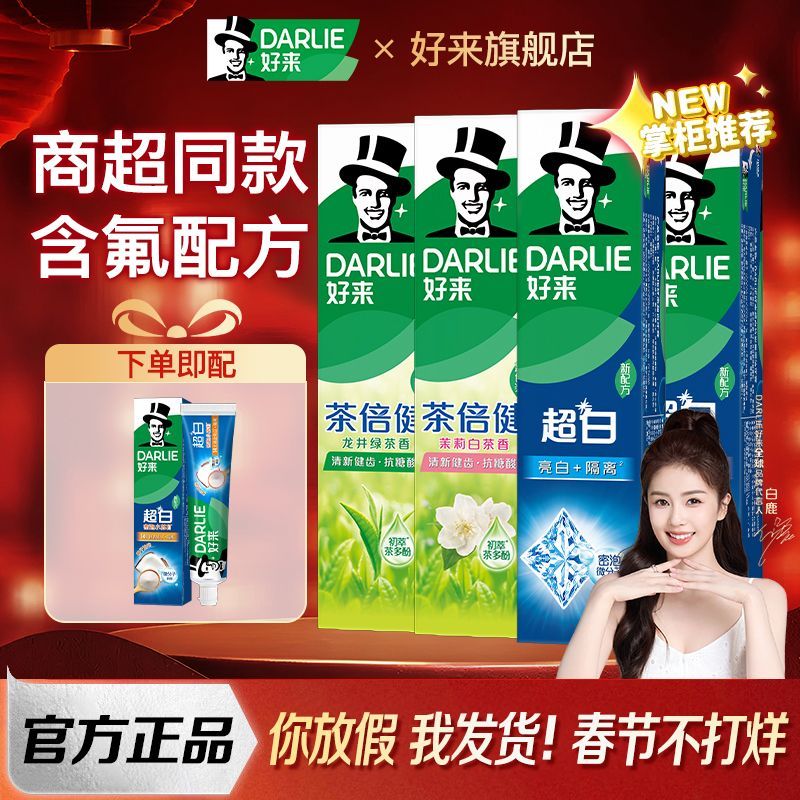 【白鹿推荐】好来黑人牙膏超白竹炭茶倍健龙井绿茶含氟清新口气